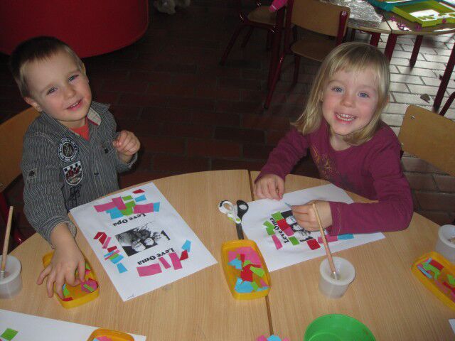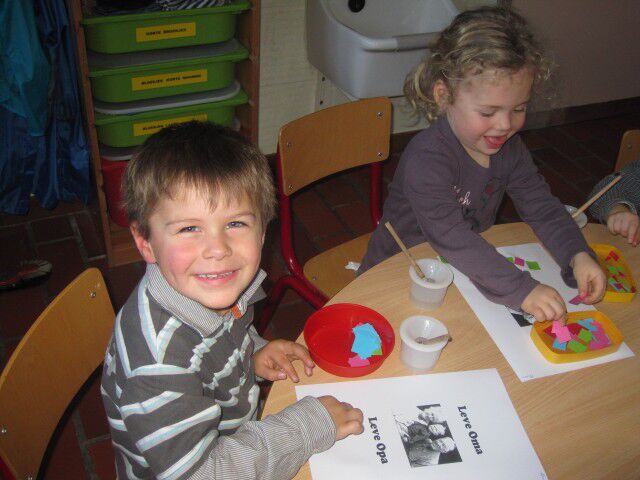 Wij knippen repen gekleurd papier in kleine stukjes en kleven ze als versiering rond een foto van oma en opa.