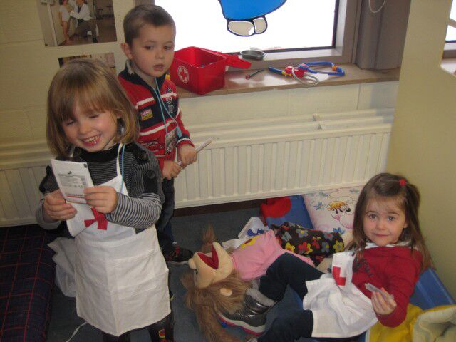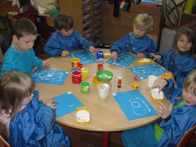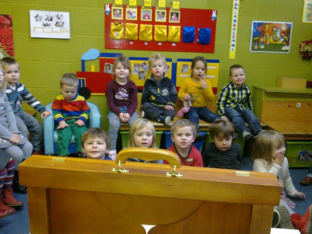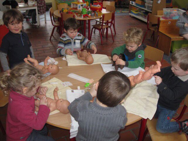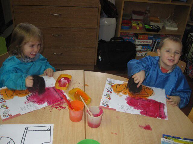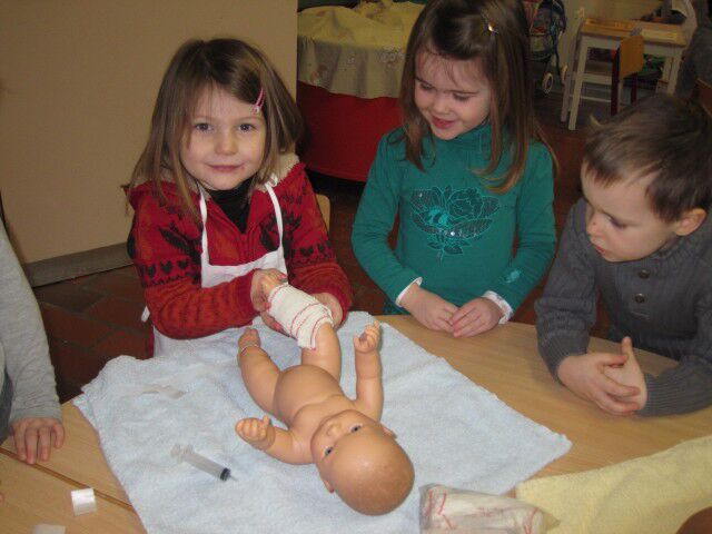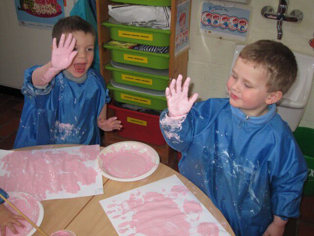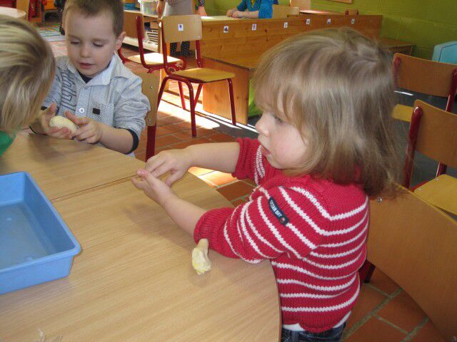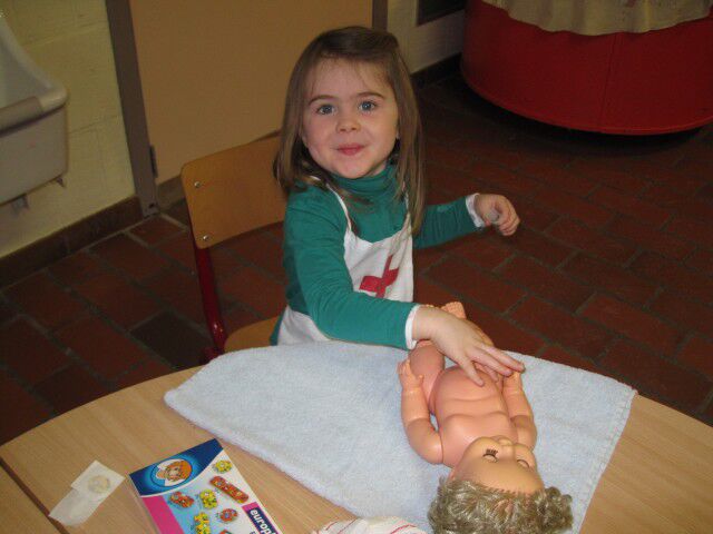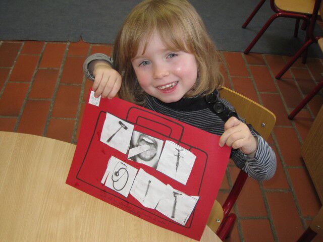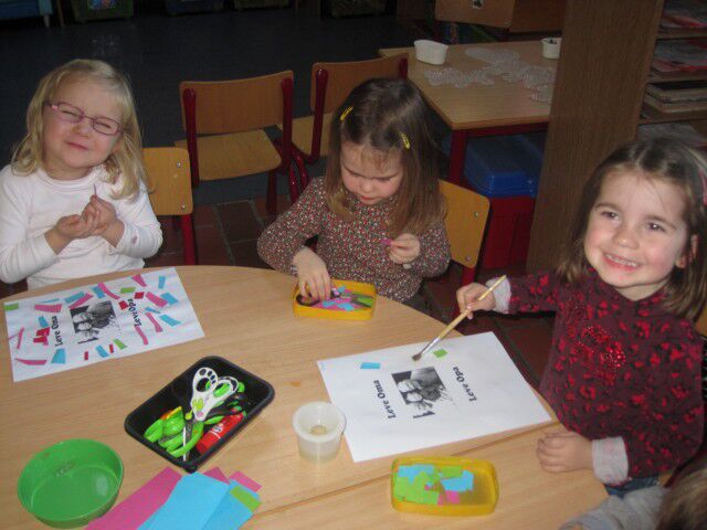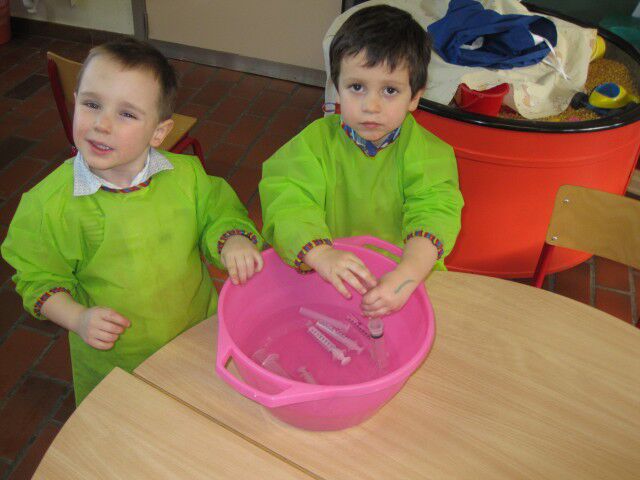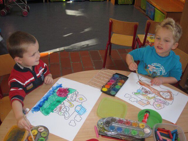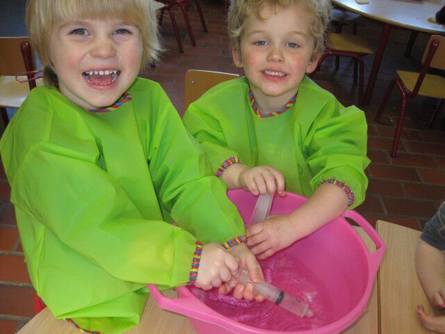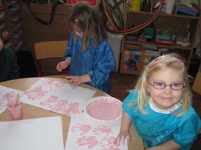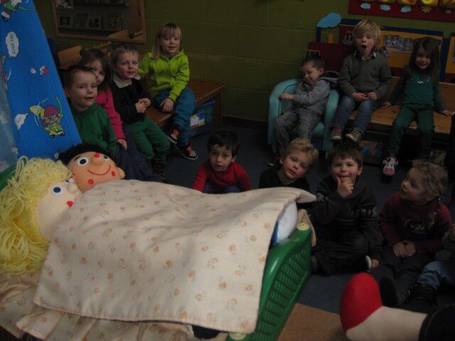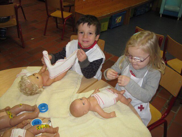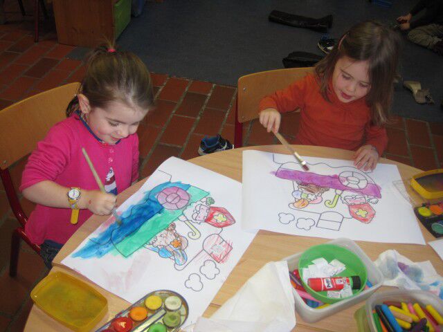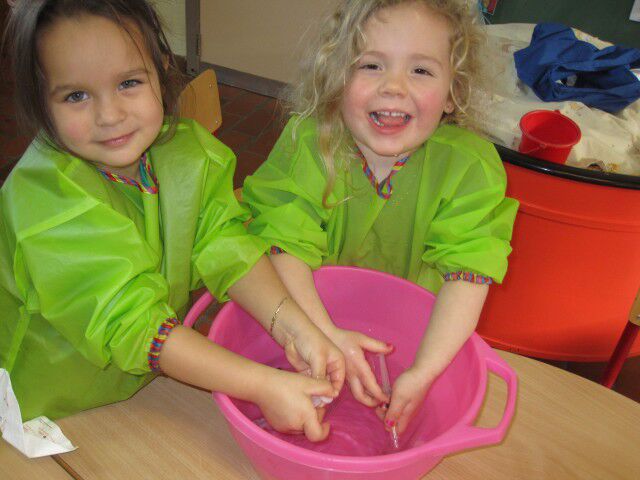 De juf heeft eerst tafelpoppenspel gespeeld over twee handjes Leentje en Pietje. Leentje ging schilderen maar keek niet goed uit en is in de verf gevallen. Ze was helemaal vies en moest nadien zich goed wassen met water en zeep.