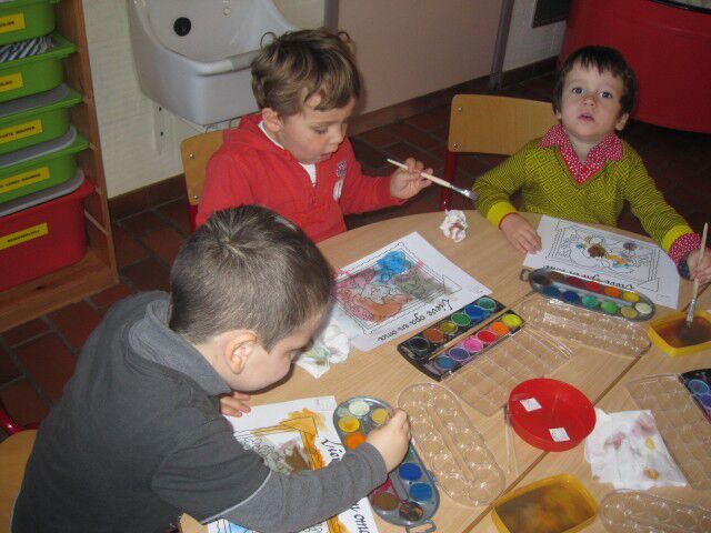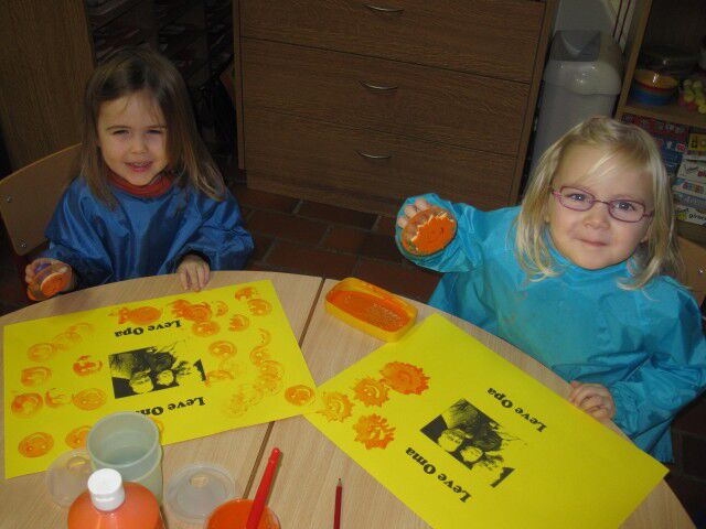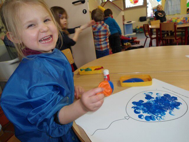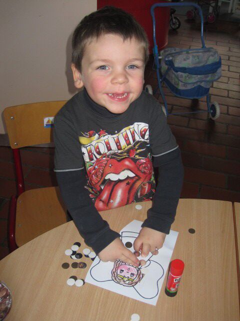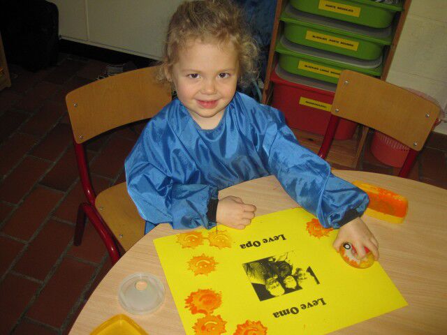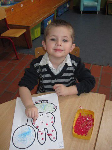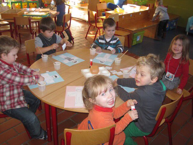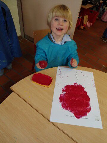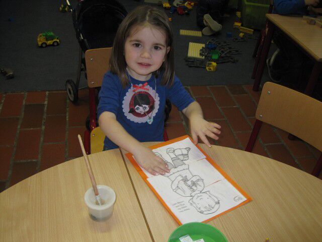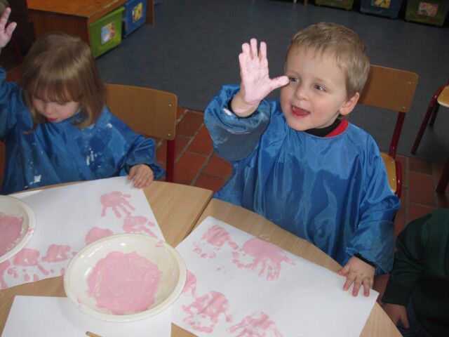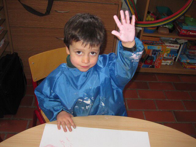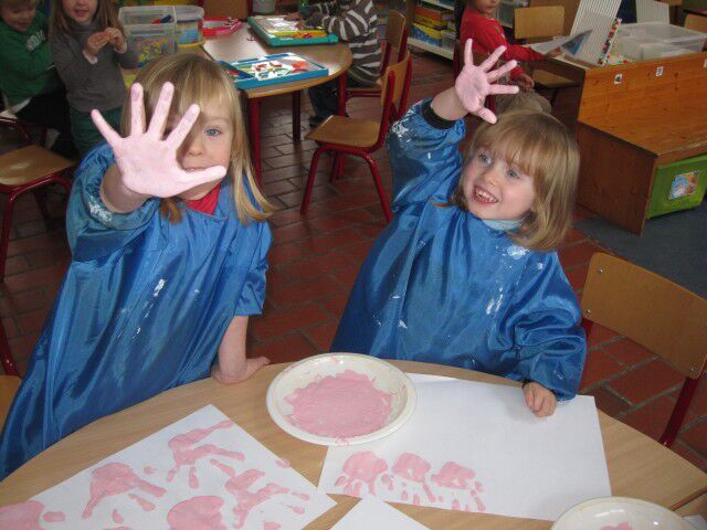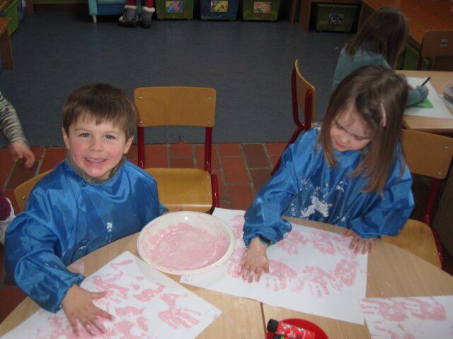 De juf tekende ook een gezichtje op de handen van de kleuters en zij zijn net als in het poppenspel in de verf gevallen. De kleuters maakten zo afdrukken van hun handjes. Plezant dat ze dit vonden.