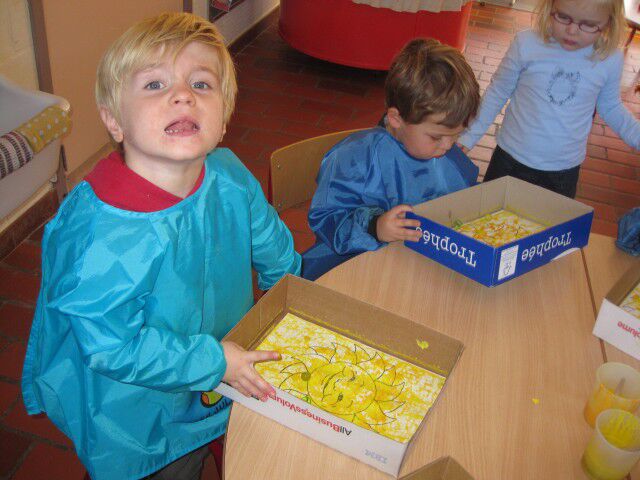 We geven ons zonnetje een mooi geel kleurtje door de knikker heen en weer te laten rollen door de gele verf.