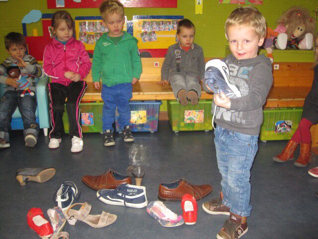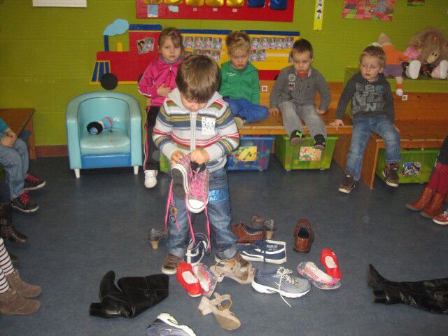 We gaan telkens twee dezelfde schoenen zoeken, paren maken . We nemen de schoenen waar en de juf stopt één paar in de schoendoos. Welk paar is weg ?