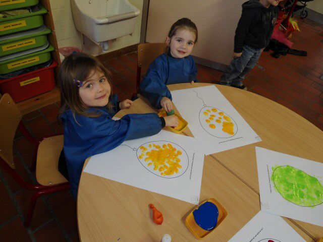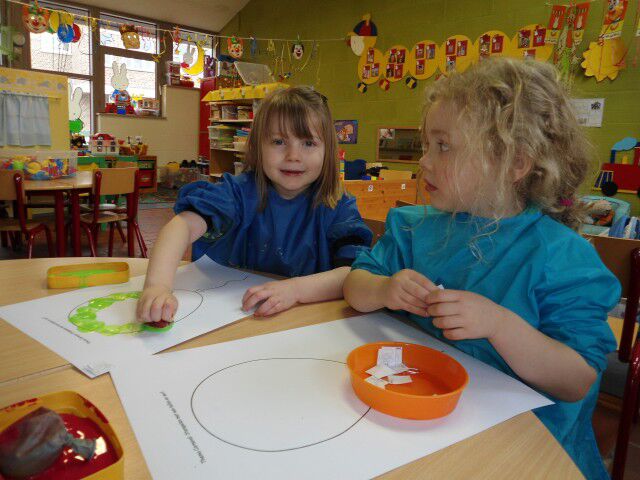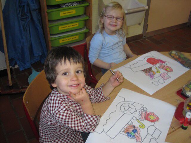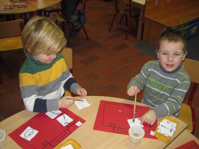 We schilderen de clowntjes hun pak in dezelfde kleur als hun hoedje. We leren kleuren identificeren en benoemen.