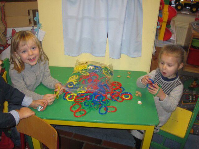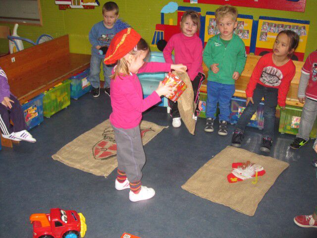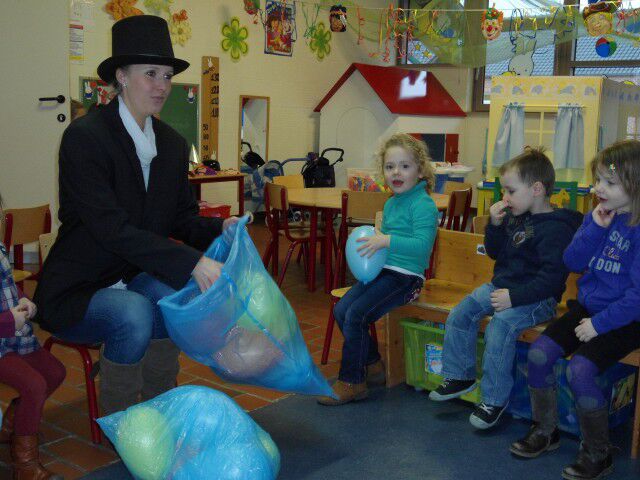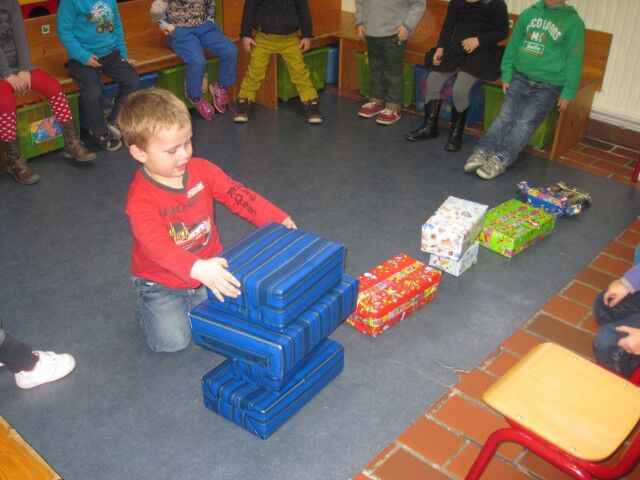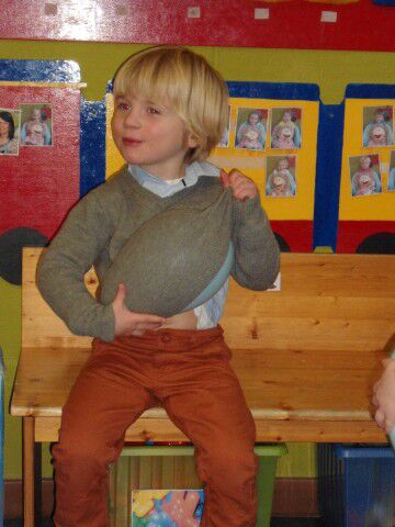 We hebben een kleine, een grote en een middelgrote zak. We stoppen de cadeautjes in de juiste zak , we kijken naar de grootte. Begrippen klein en groot komen spelenderwijs aanbod.