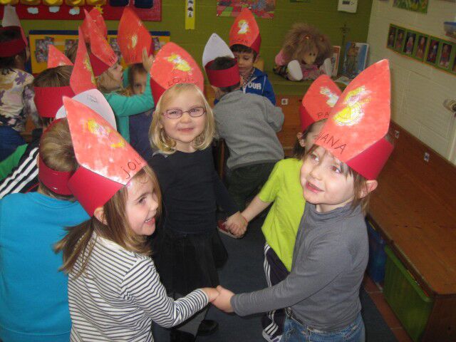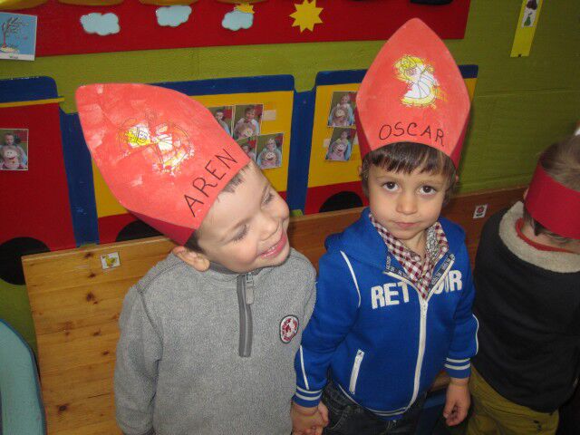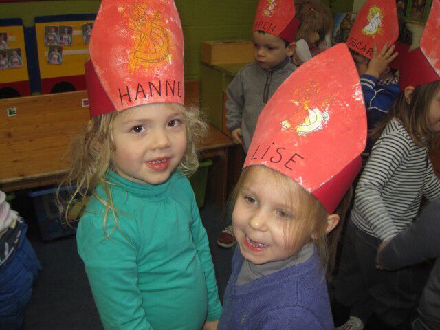 We stempelen met een sponsje een mooie mijter zodat wij kleine sinterklaasjes zijn als de Sint op bezoek komt in de klas.