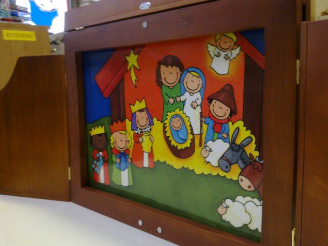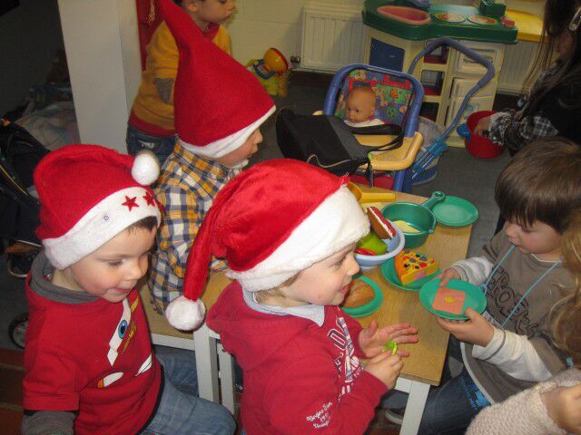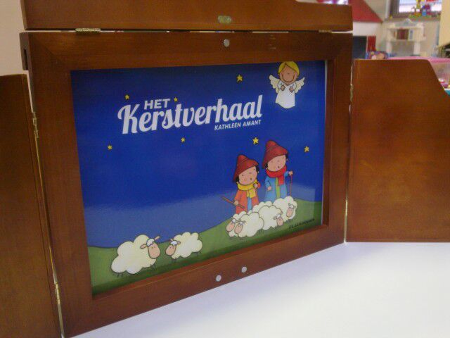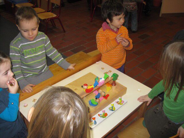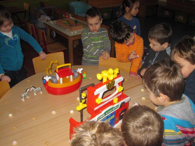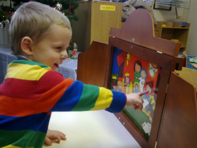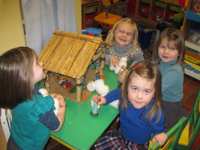 De juf heeft het kerstverhaal verteld en de kleuters mogen spelen met het kerststalletje en de figuren van de kerststal. Ze bootsen het verhaal na.