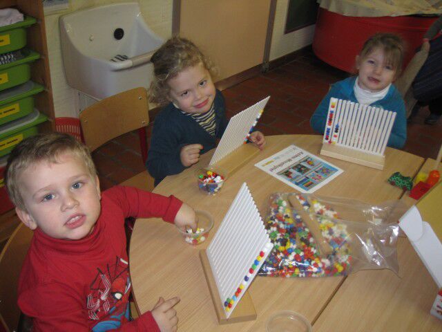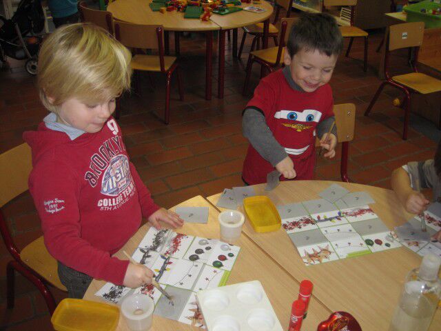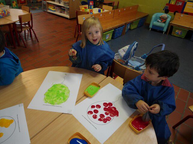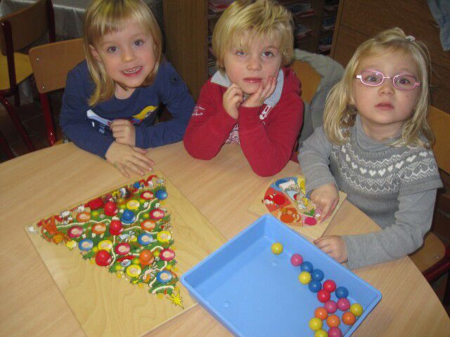 We hebben eerst de kerstboom mooi groen geschilderd en kleven nu op elk kruisje een kerstbal. We oefenen de 1 - 1 relatie in.