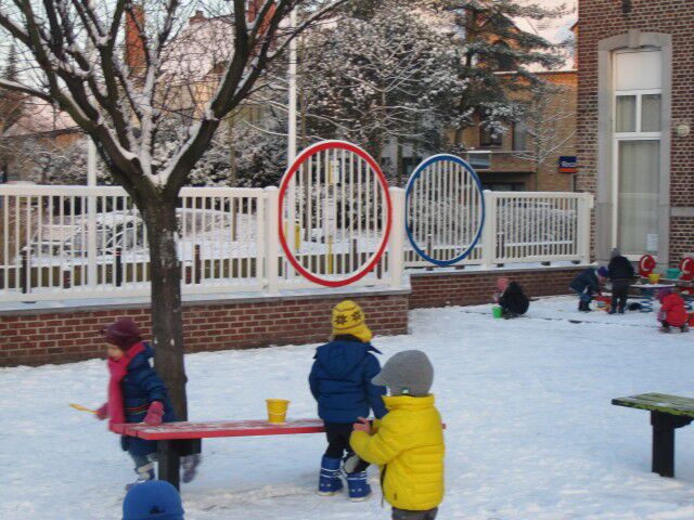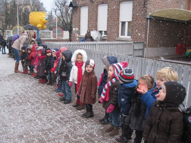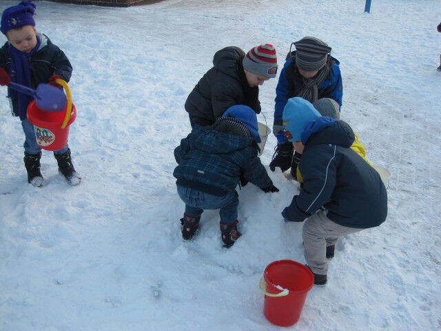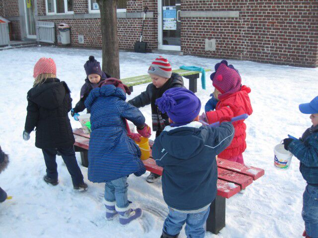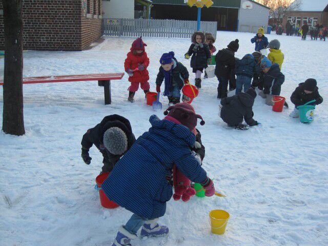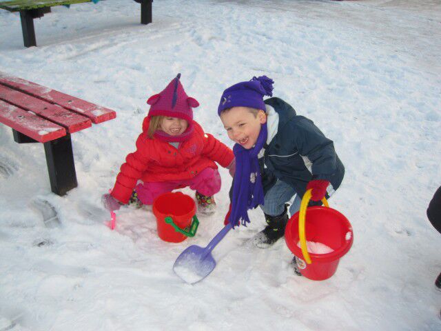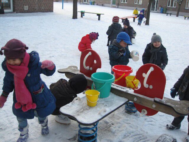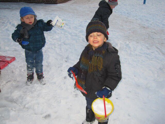 De kleuters kregen allemaal een emmer en een schepje en mochten sneeuw scheppen.