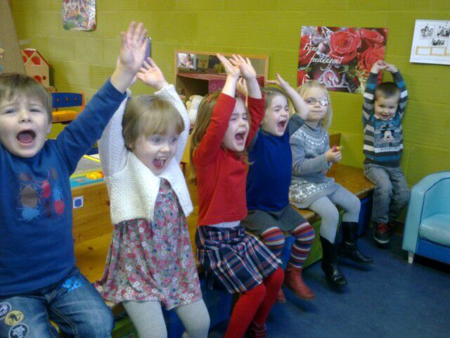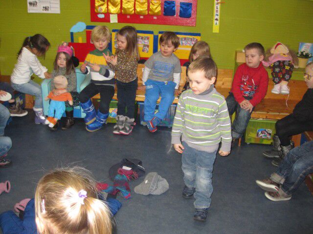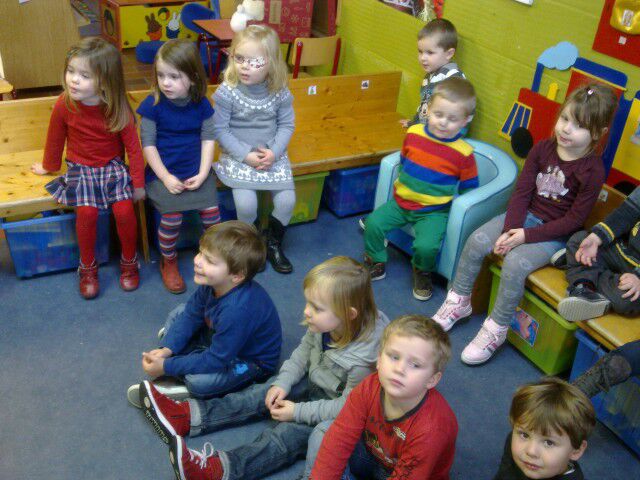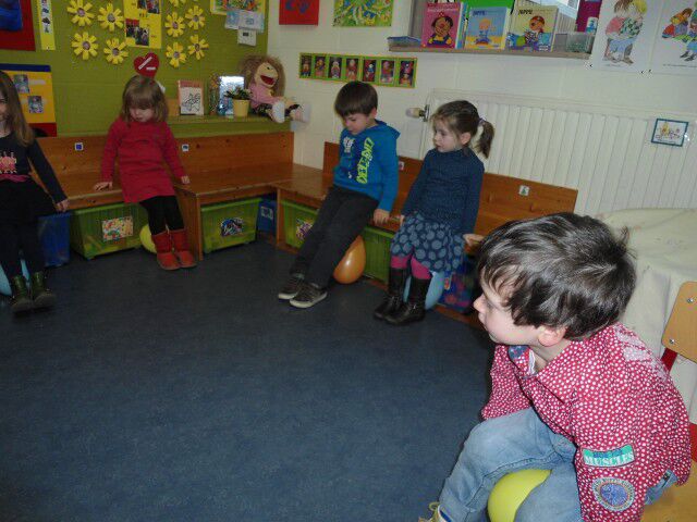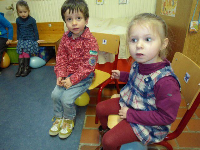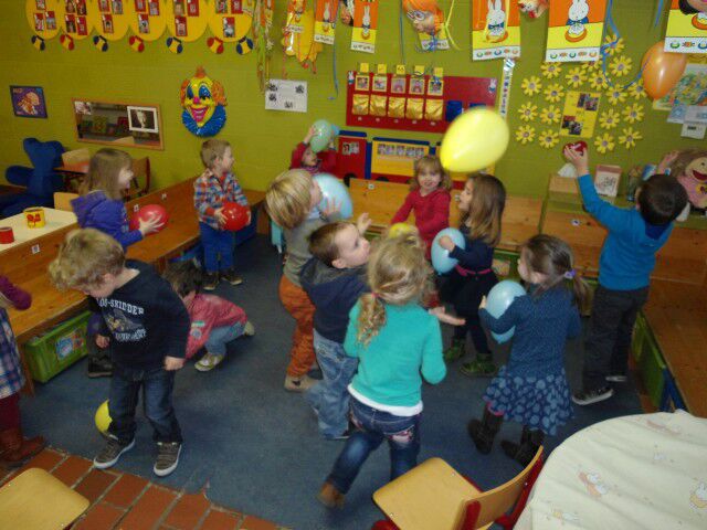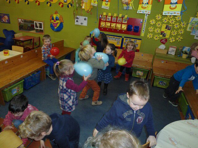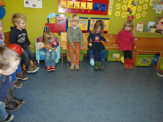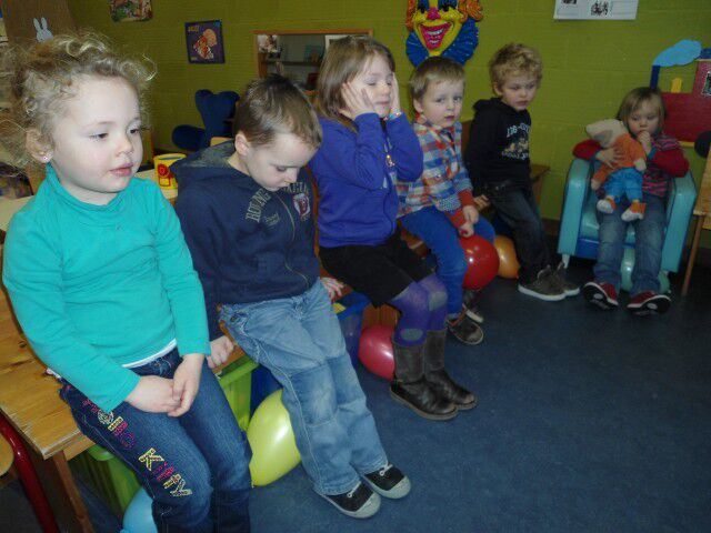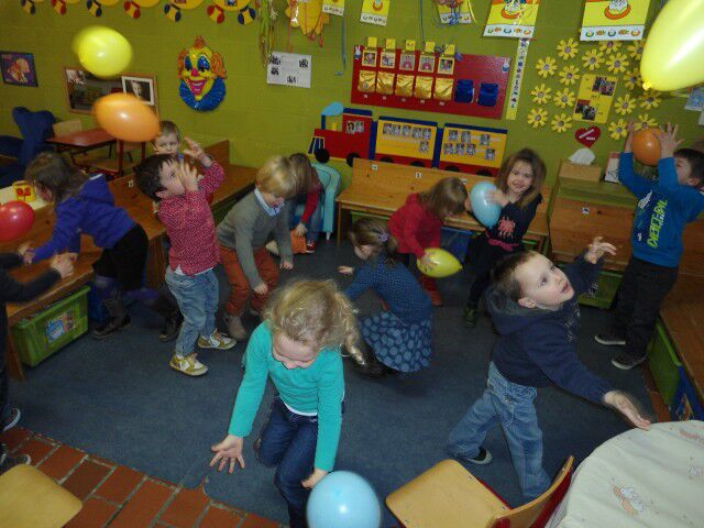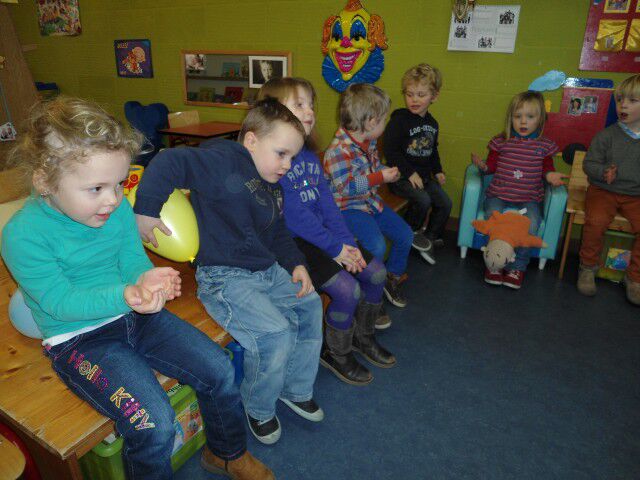 We deden de stoelendans op carnavalmuziek en telkens als de muziek stopte, voerden we een opdrachtje uit. Spelenderwijs oefenden we de ruimtelijke begrippen in.