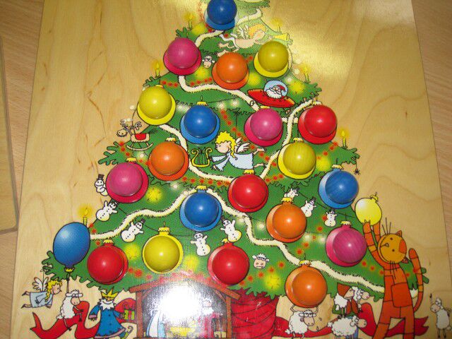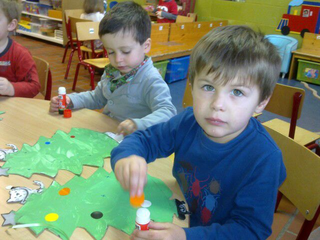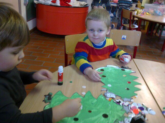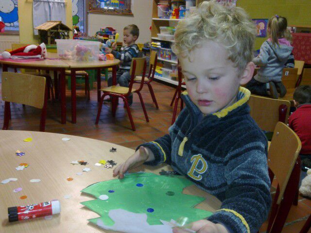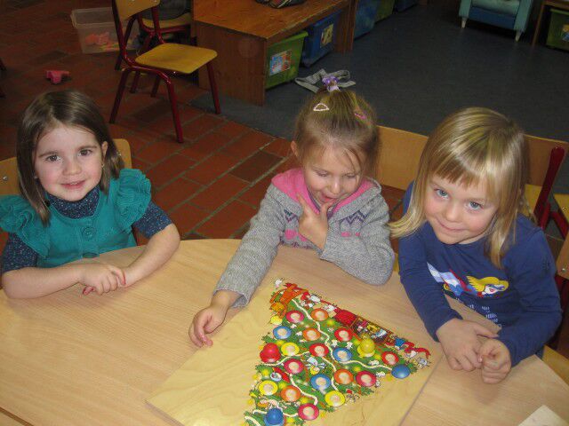 We spelen het kerstboomballenspel.De kleuters draaien om beurt aan de kleurendraaischijf. Ze nemen een kerstbal in de kleur die de draaischijf aangeeft. We versieren zo de kerstboom en leren kleuren benoemen en identificeren.
