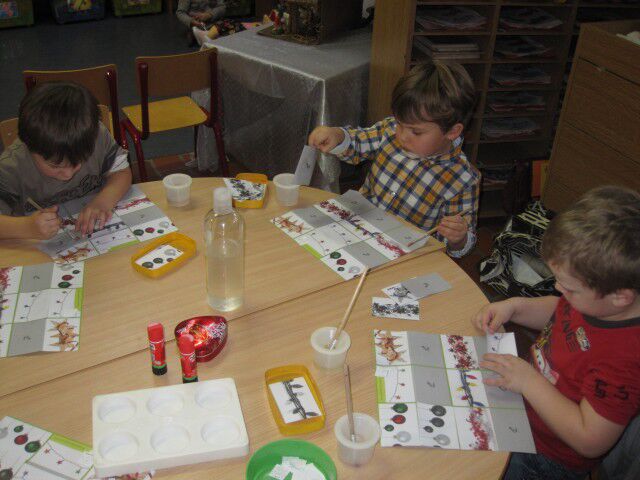 Kleefoefening : Kleef de juiste zwart-wittekening onder de gekleurde kerstversiering. De juf geeft de opdracht en de kleuters brengen ze zelfstandig tot een goed einde.