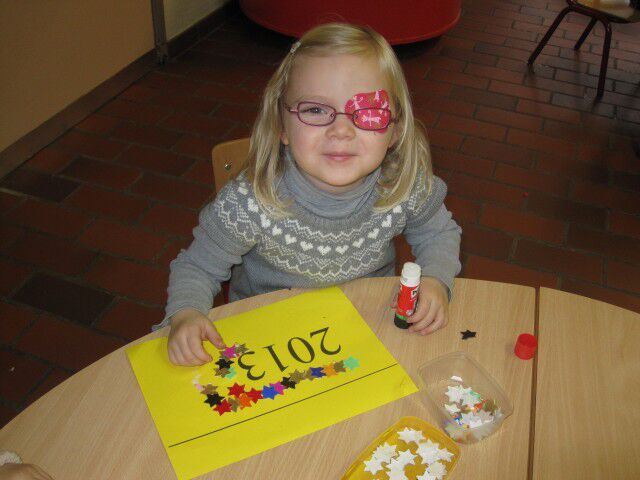 We versieren ons nieuwjaarsbriefje door mooie gekleurde sterren rond 2013 te kleven.