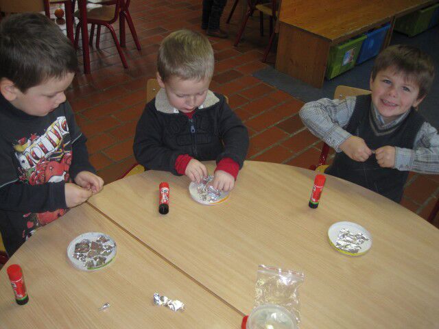 We gaan een kerstengeltje knutselen. We versieren het dekseltje met stukjes zilverpapier.