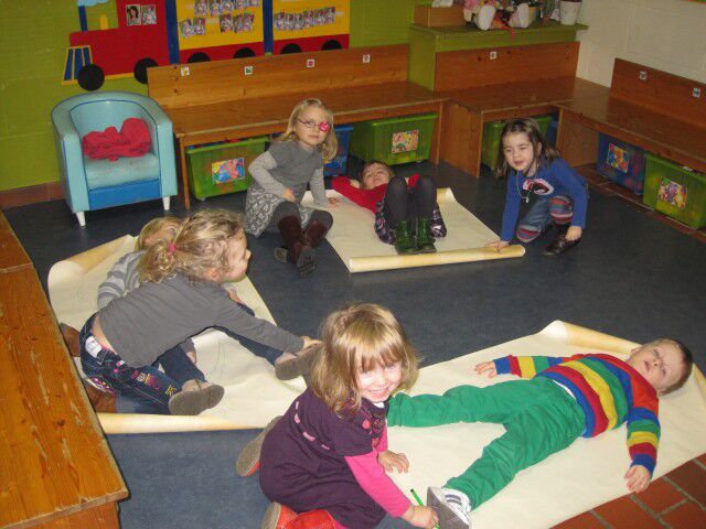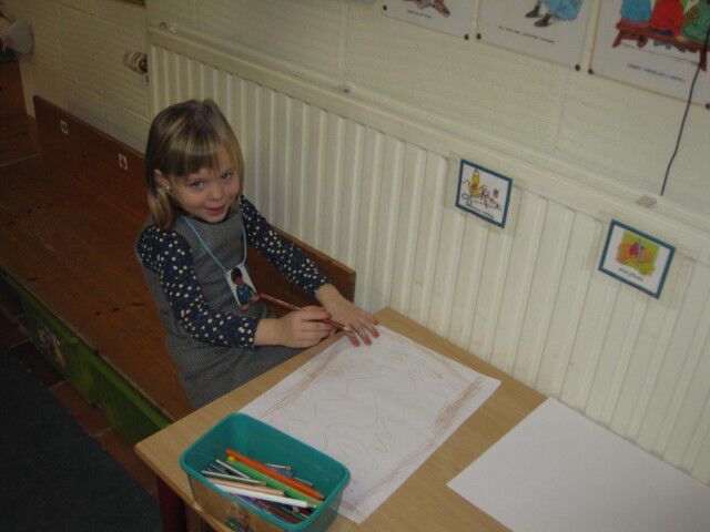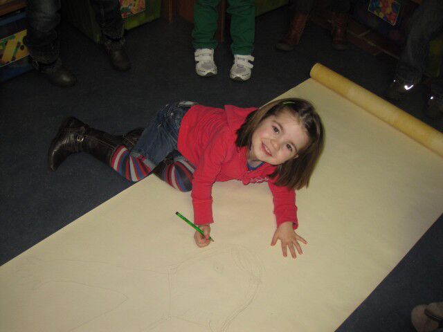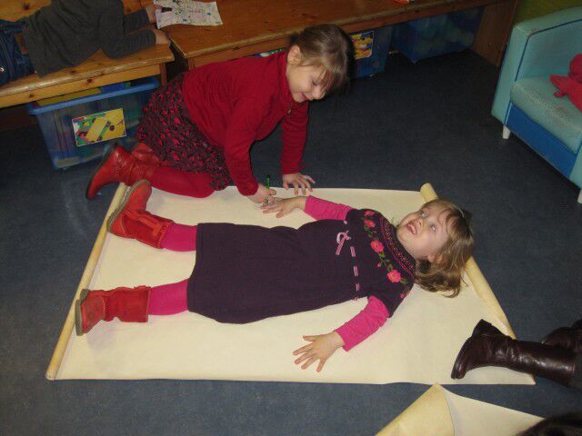 In ons klasje werkten we rond het thema" MIJN LICHAAM". De juf tekende een kleutertje na op een groot blad en nadien mochten de kleutertjes het zelf doen.