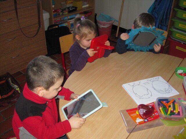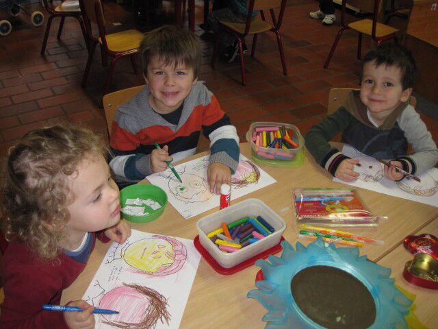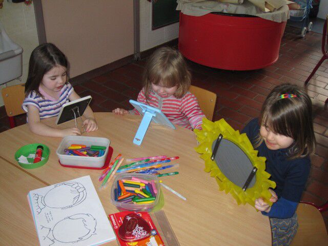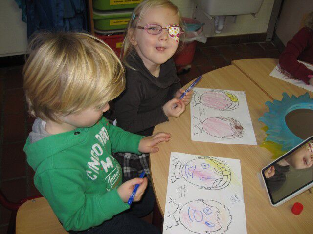Nadat we ons eigen gezichtje hadden waargenomen in de spiegel tekenden we ogen, een neus en mondje op de gezichtjes .