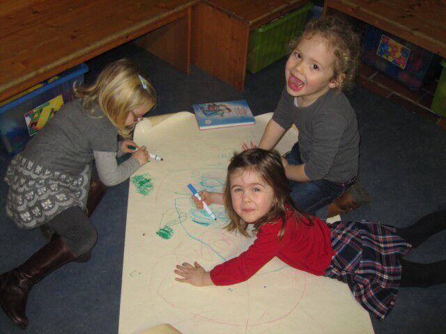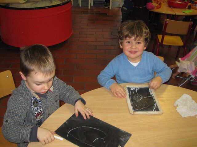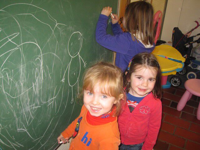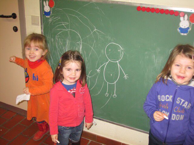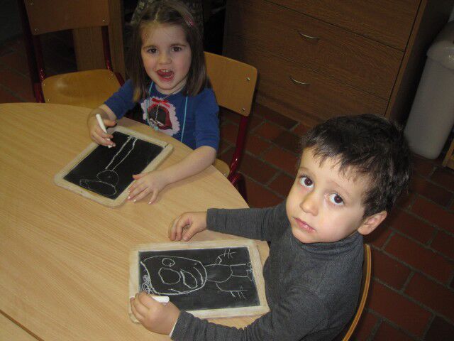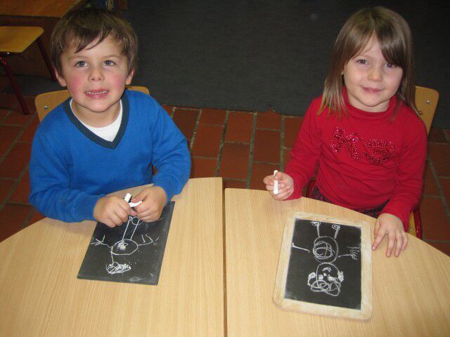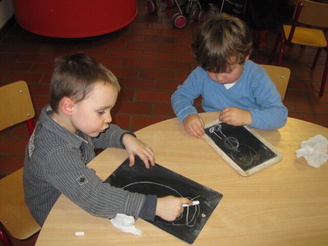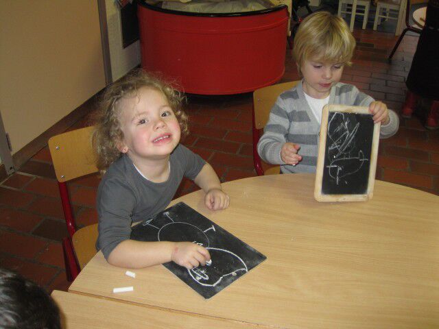 We leren ook een kindje tekenen met krijt op het kleine bordje.