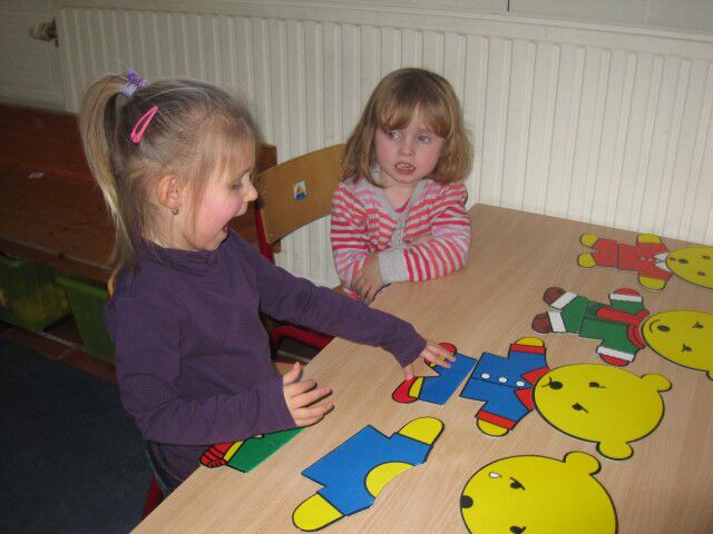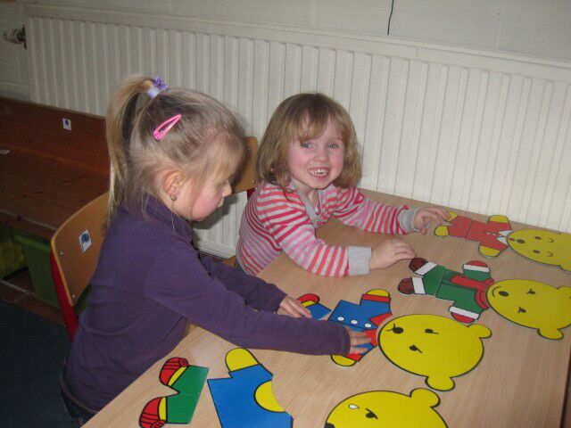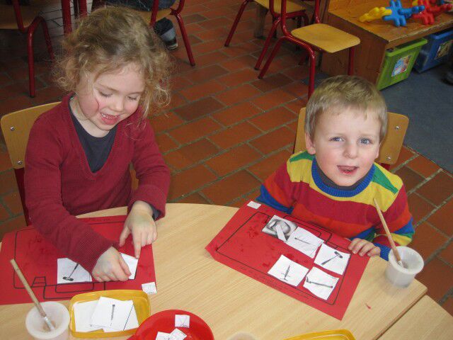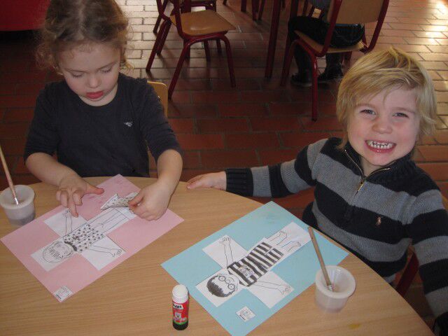 Spelenderwijs oefenden we het lichaamsschema in. Hier puzzelen we de foto van Max en Fien terug in elkaar. We kijken goed. Het hoofdje bovenaan , daaronder de buik met de armen en handen en helemaal onderaan de benen en voeten.