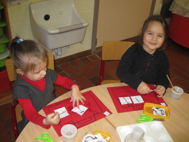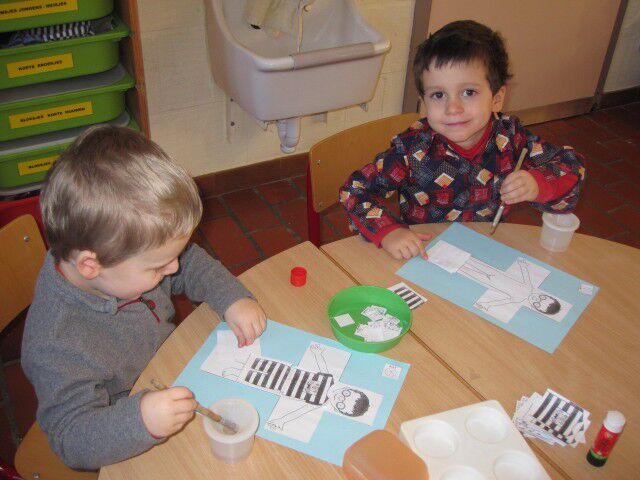We kleden Max en Fien aan. We kleven het bloesje op de buik, de broek op de benen en de pantoffeltjes op de voeten.