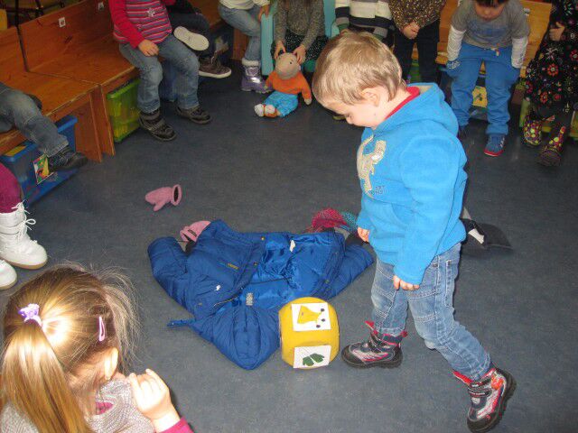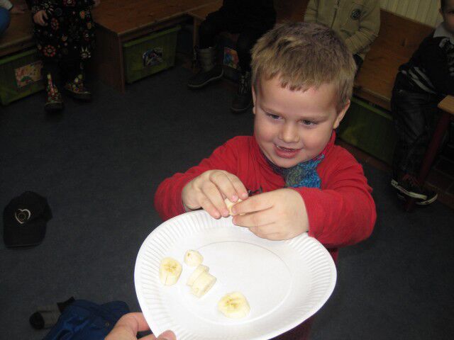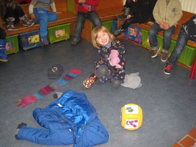 We spelen het spelletje : Kleed je aan, eet een banaan ! We gooien om beurt met de dobbelsteen en doen dat kledingstuk aan dat bovenaan op de dobbelsteen staat. Nadien mogen we een stukje banaan eten.