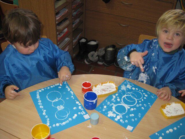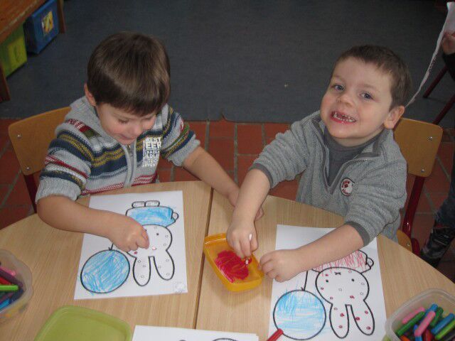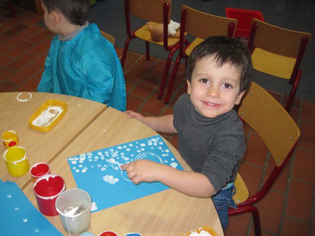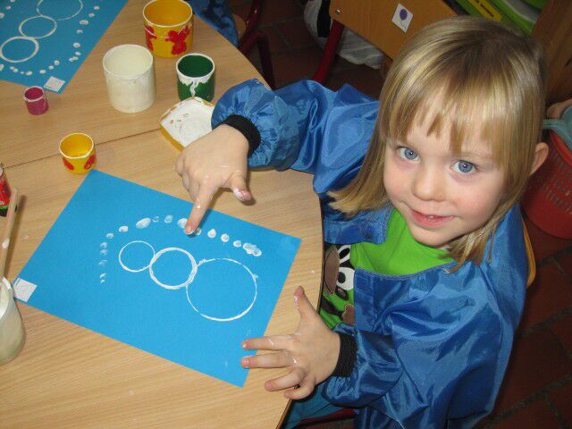 Nu mochten de kleuters zelf een sneeuwman maken. We stempelden eerst met een groot potje de buik en met een kleiner potje het hoofd , mooi boven elkaar. De begrippen klein en groot kwamen aanbod. We stempelden met ons vingertje ook nog veel sneeuw rond de sneeuwman.