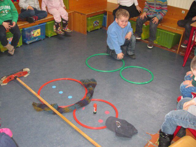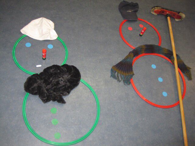 De juf had een verhaaltje verteld over een sneeuwman. Nadien gingen we zelf een sneeuwman samenstellen van twee hoepels. De grootste hoepel gebruikten we voor de buik en de kleinere hoepel vormde het hoofd. Nu nog ogen, een neus, mond , een hoed opzetten , een sjaal aandoen en een borstelsteel in de hand geven en klaar is onze sneeuwman.