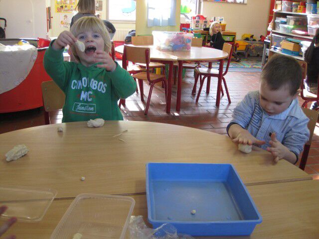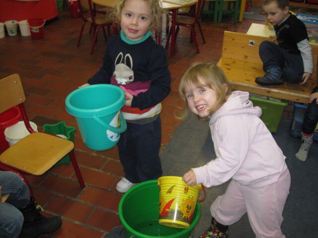 We hebben de emmertjes met sneeuw mee naar ons klasje genomen en gekeken wat ermee gebeurde. De sneeuw was gesmolten en water geworden. Om beurt mochten we ons emmertje komen leeggieten in de grote emmer. In sommige emmertjes zat er veel water, in andere weinig.