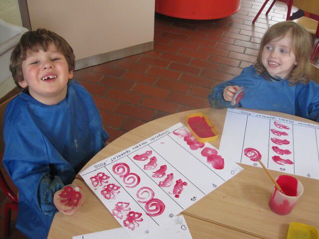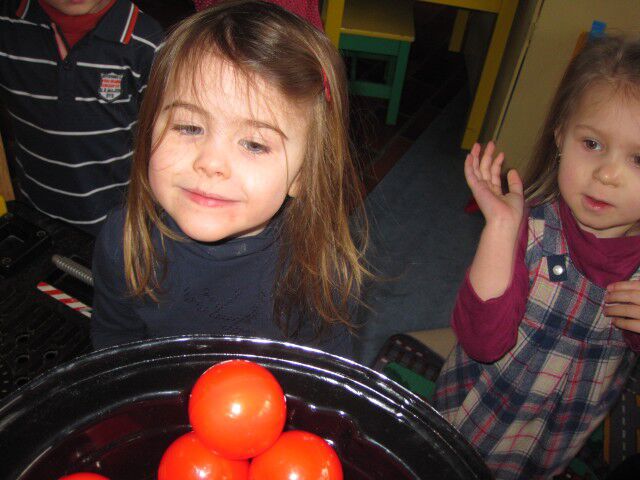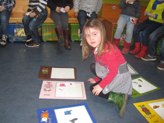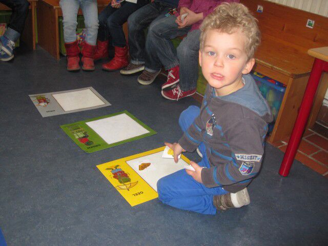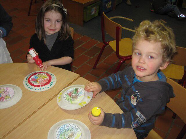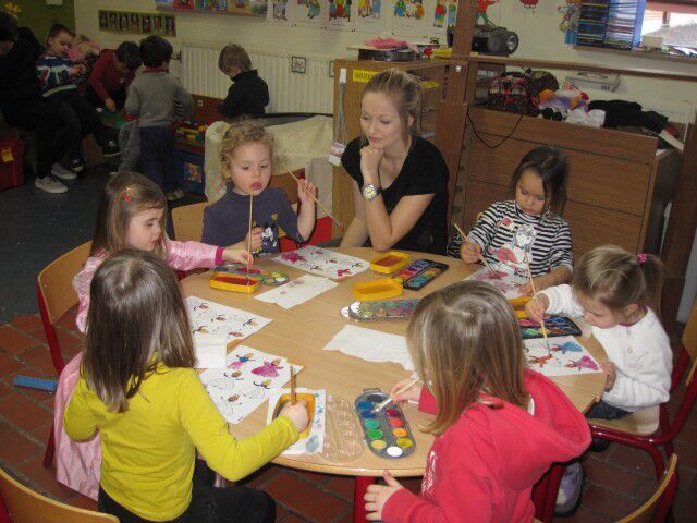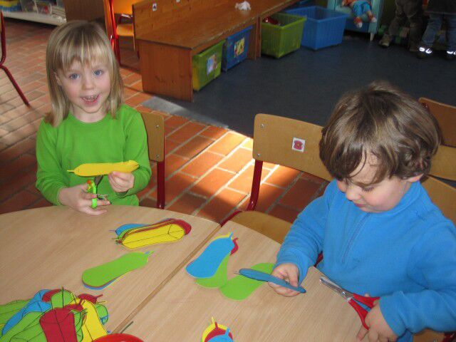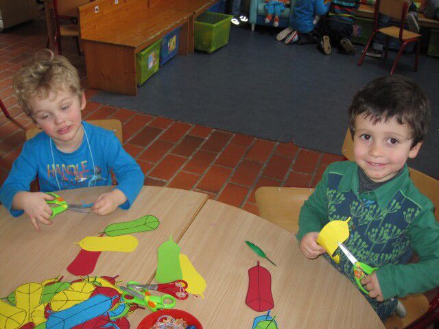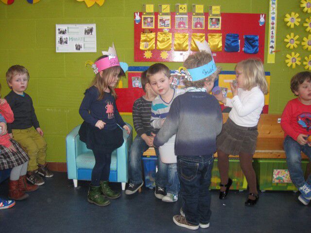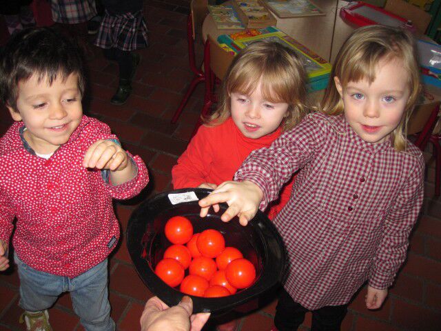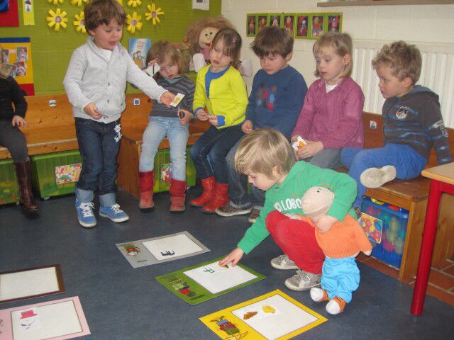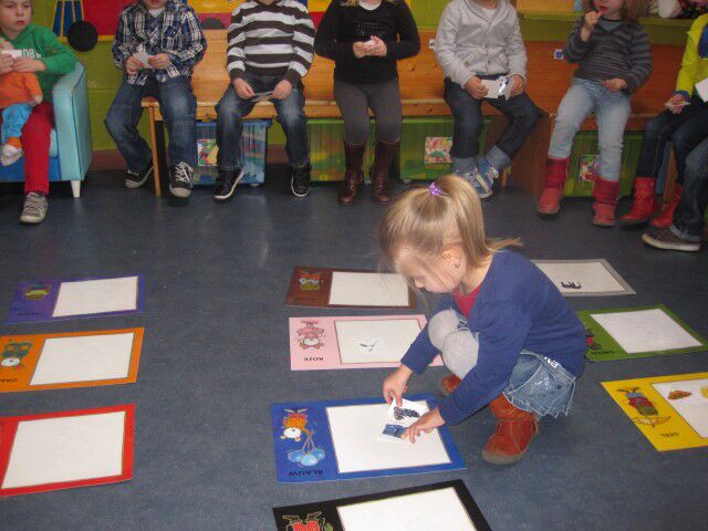 De kleutertjes moesten ze in het juiste mandje gaan leggen.