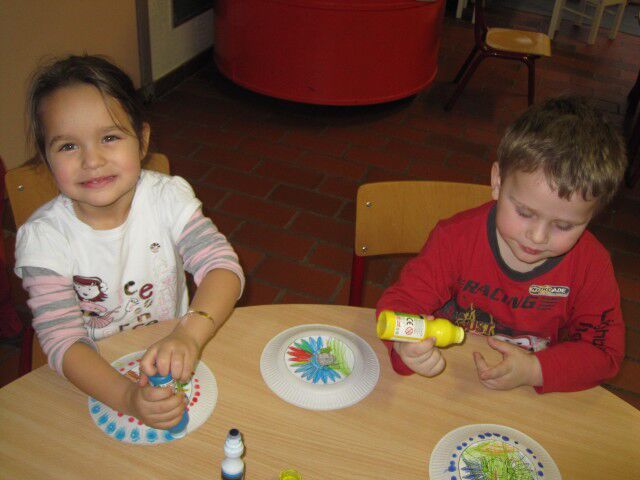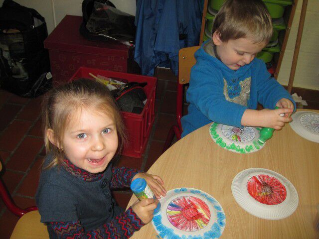 We stempelen mooi aan de kant van het kartonnen bordje met mooie kleuren.