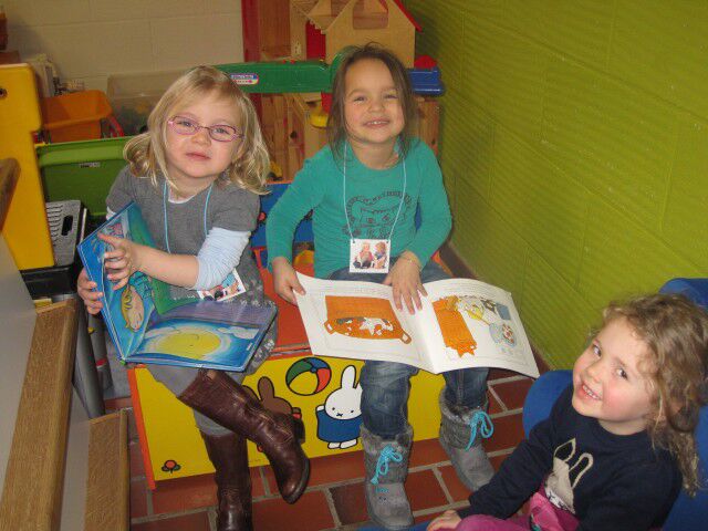 Louise, Yuna en Hanne genieten van het kijken in boekjes.