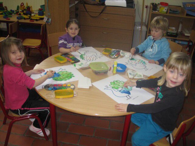 We schilderden een groot ei of een paashaasje in met waterverf.
