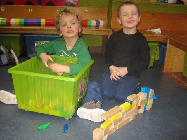 Miel en Jorrit spelen zo fijn samen en bouwen een lange muur van blokken.