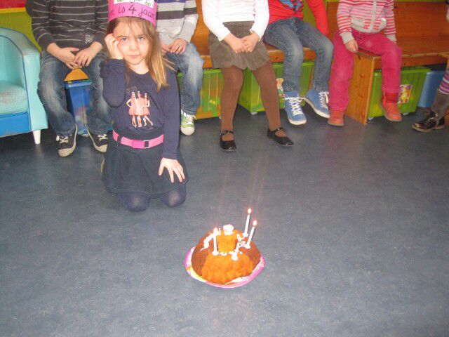 Pauline mag 4 kaarsjes uitblazen op de taart.
