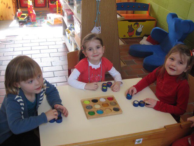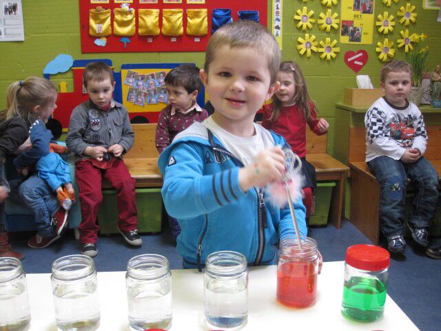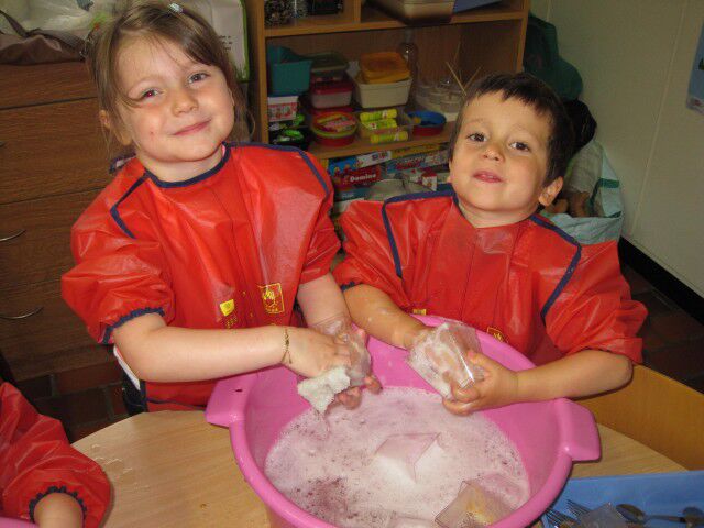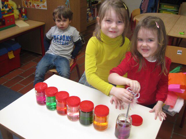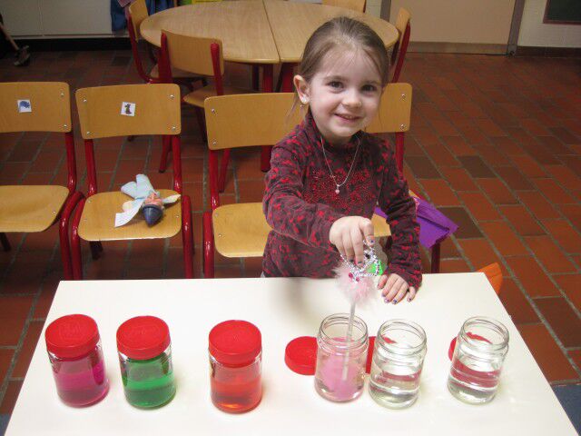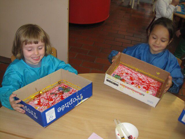We maken mooie rode hartjes door de knikkers door de ecoline verf te laten rollen.