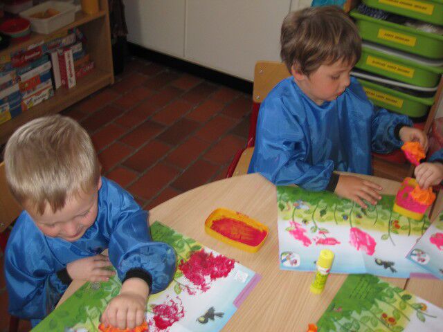 We stempelen een mooie rozentuin door een prop papier in de verf te dompelen