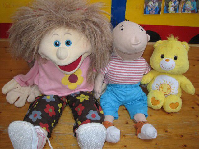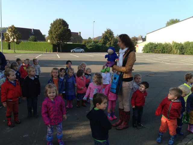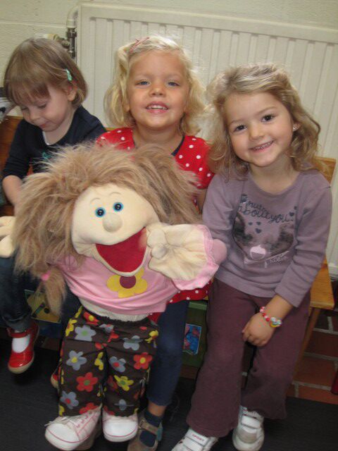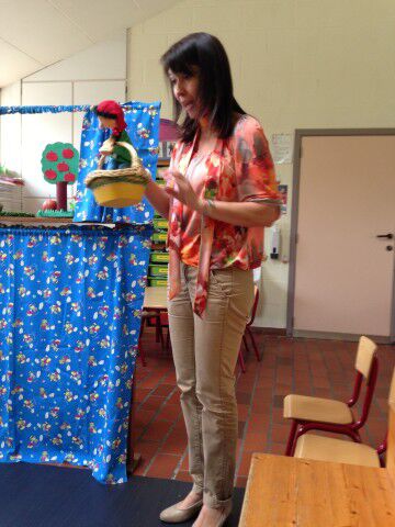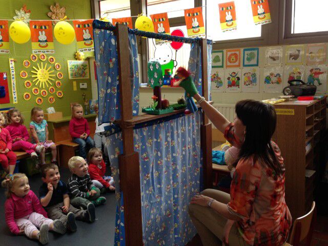 Juf Elke was met haar kleutertjes bij ons naar de poppenkast komen kijken