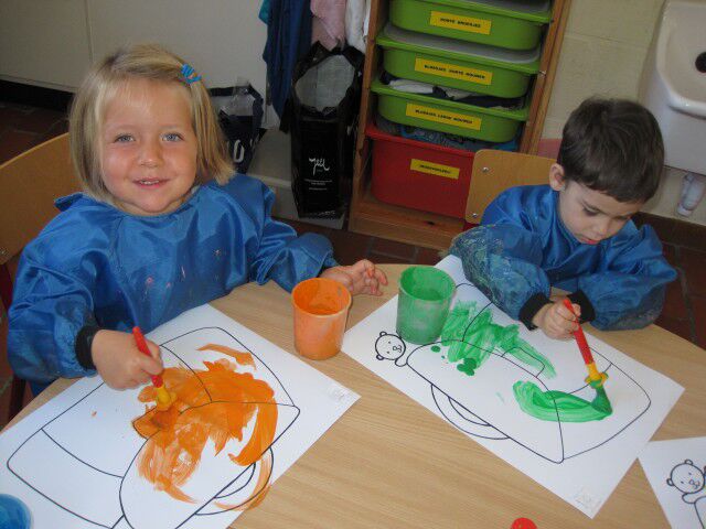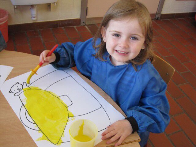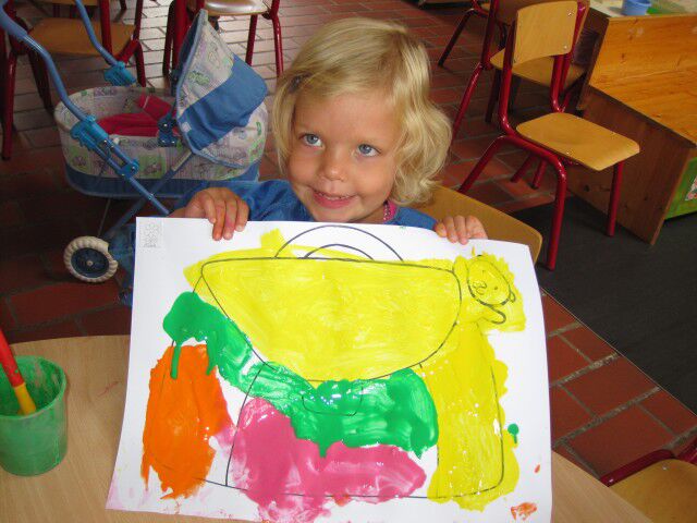 De kleuters gingen een boekentas schilderen en kozen zelf een mooie kleur.