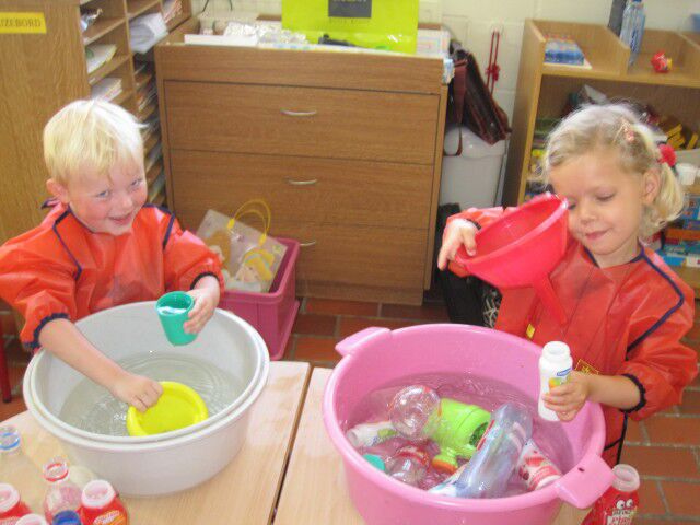 We werkten in ons klasje rond water en zand. Eerst hadden we in de waterbak proefjes gedaan rond drijven en zinken en nadien mochten de kleuters flesjes vullen en kwamen de begrippen vol en leeg aanbod. De gevulde flesjes werden geteld en met elkaar vergeleken.