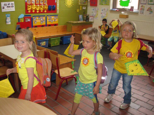 De laatste schooldag stond alles in het teken van de gele kleur. De kleur van de zon, een zonnetje zijn voor elkaar, ook in de vakantie. s'Morgens vond er een mooie viering plaats met de ganse school in de turnzaal. We knutselden een mooie gele windvlieger met aan de achterkant een mooie boodschap op. We lieten de windvliegers vliegeren in de klas op de tonen van het vliegtuiglied.