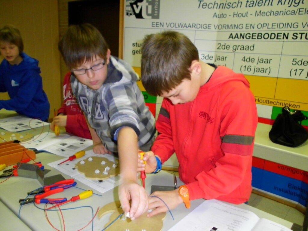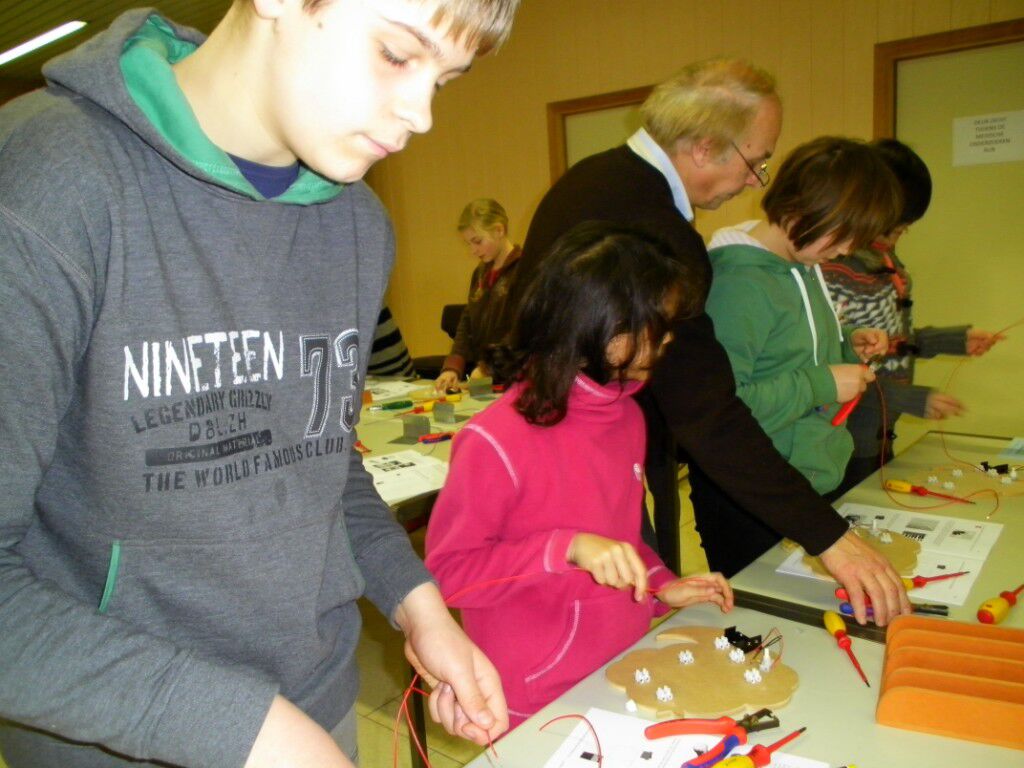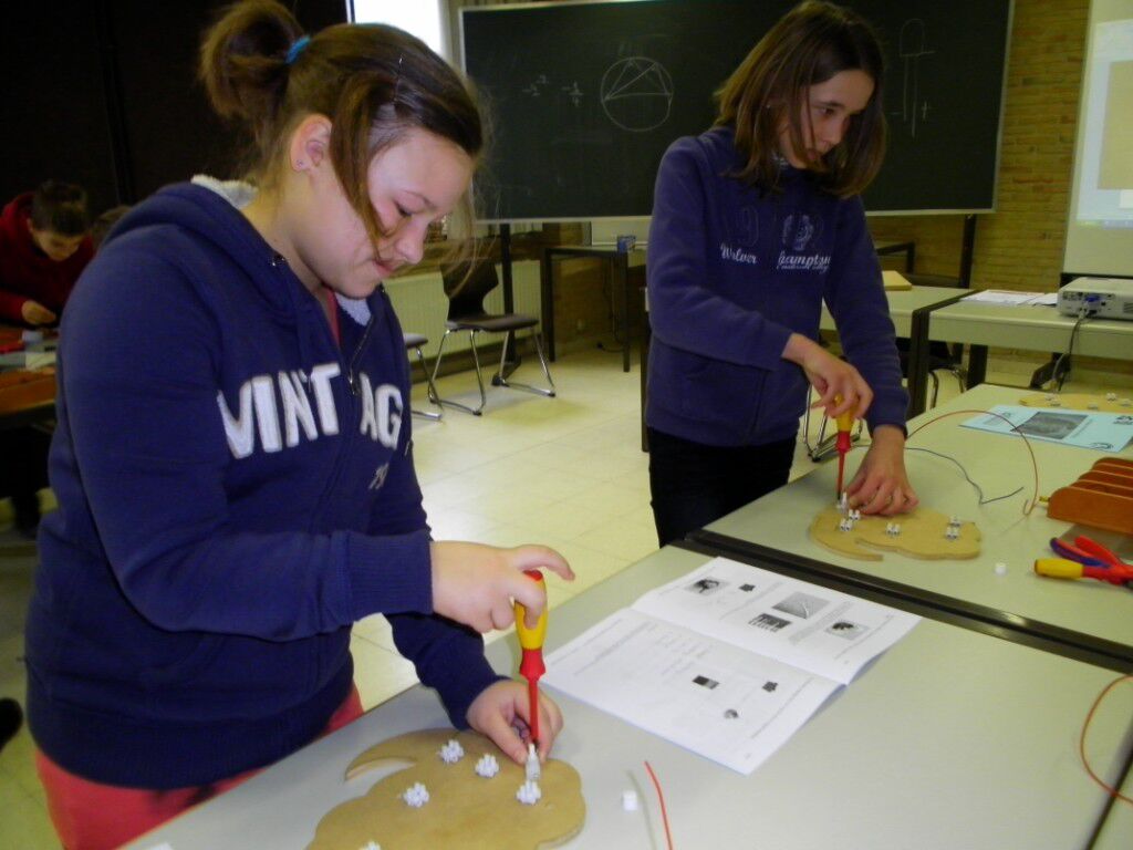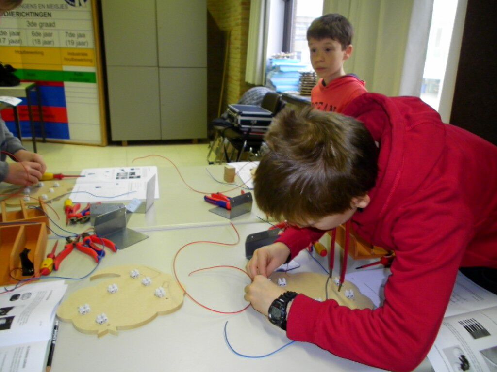 We kregen uitleg en gingen aan de slag. We plaatsten leidingen , ledlampjes , een batterijhouder, een weerstand,...