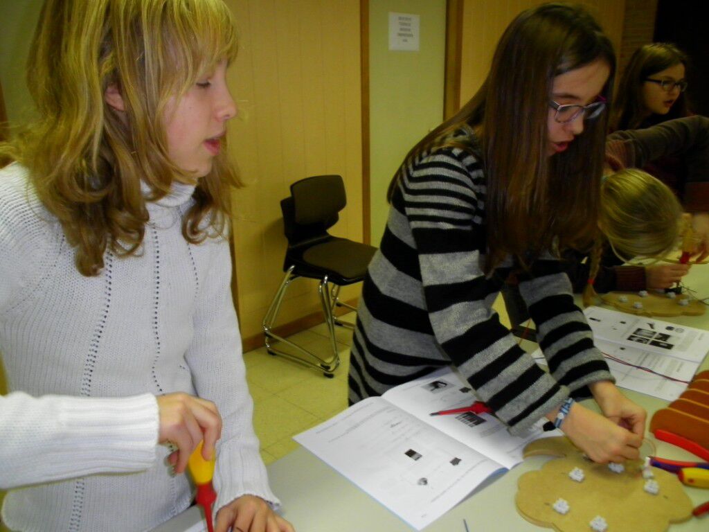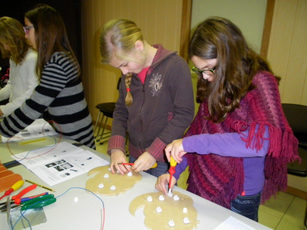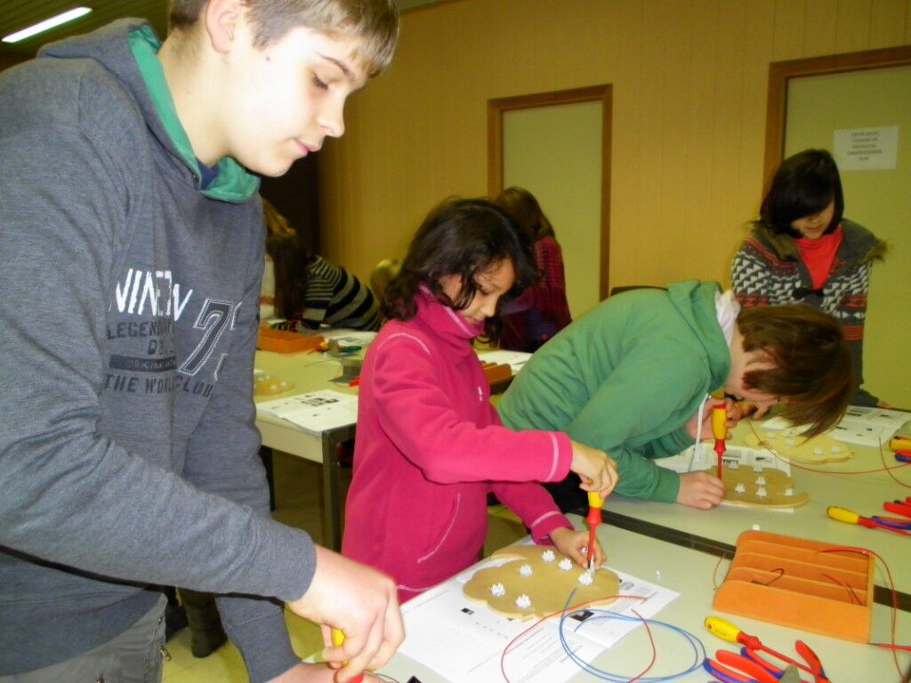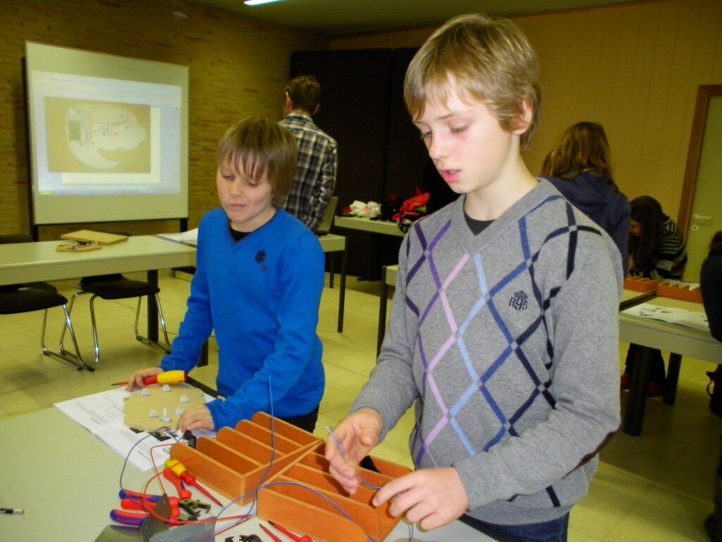 We kregen uitleg en gingen aan de slag. We plaatsten leidingen , ledlampjes , een batterijhouder, een weerstand,...