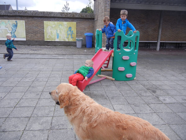Drée, mijn hond, vergezelde ons eventjes in de klas, een echte hond. Ook Saar had haar hondje mee, een knuffelhond. Bas, de klas hond, had veel vriendjes op bezoek vandaag. "Ik ben een beetje bang en een beetje niet bang..." vertelde Bent. Kleuters bovenop het klimrek, ver van de hond en dichtbij Drée... Verwondering, nieuwsgierige gezichtjes... We keken toe...en gingen eventjes wandelen met Drée aan de leiband..... Het was toch wel leuk met Drée in de klas! Werelddierendag