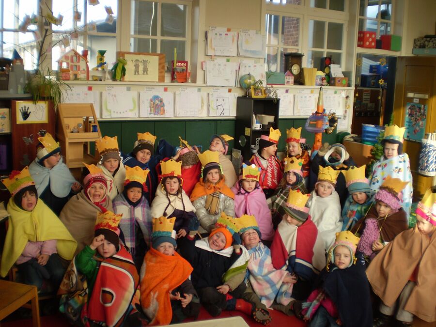 Daar kwamen 3 koningen... veel koningen samen in de gele zaal. Eerst werd geluisterd naar het verhaal 'De koningskoek'. Daarna werd van de koek geproefd... en wie vond een klein beeldje? Olivier uit K3, Kaat uit K2 en Hanne uit K1. Deze 3 koningen stapten voorop in onze stoet... en wij volgden met z'n allen de ster...