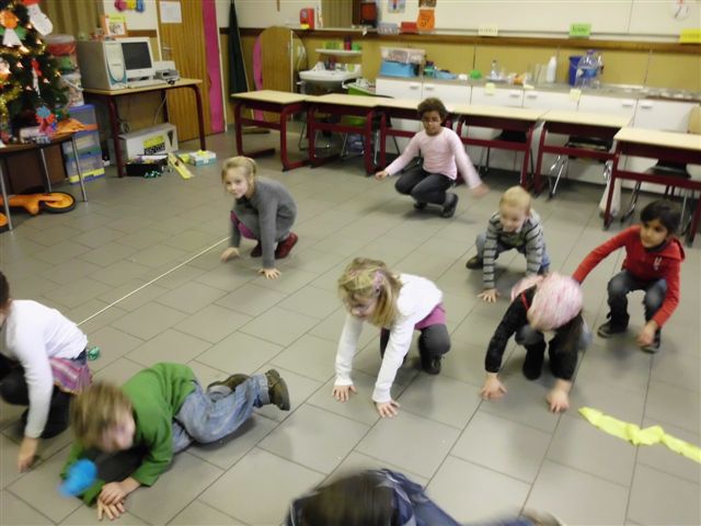 De leerlingen hadden vandaag een bewegingsles in het thema van 'feesten'. De leerlingen bewogen eerst vrij met materiaal (latten, stokken, linten, elastieken en veren). Nadien leerden de leerlingen passend bewegen met het materiaal: stijf als een stok, sierlijk als een lint, dwarrelend als een veer, ... Ze voerden dan opnieuw een dans met materiaal uit maar probeerden nu juist te bewegen. Dit alles gebeurde op vrolijke muziek.