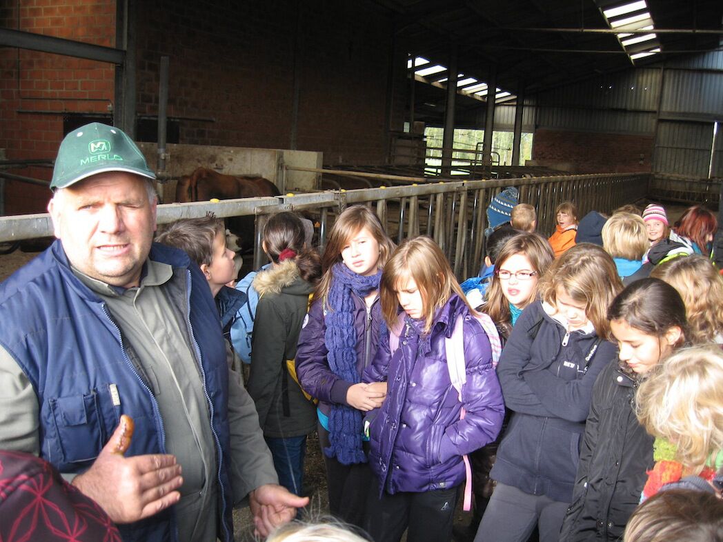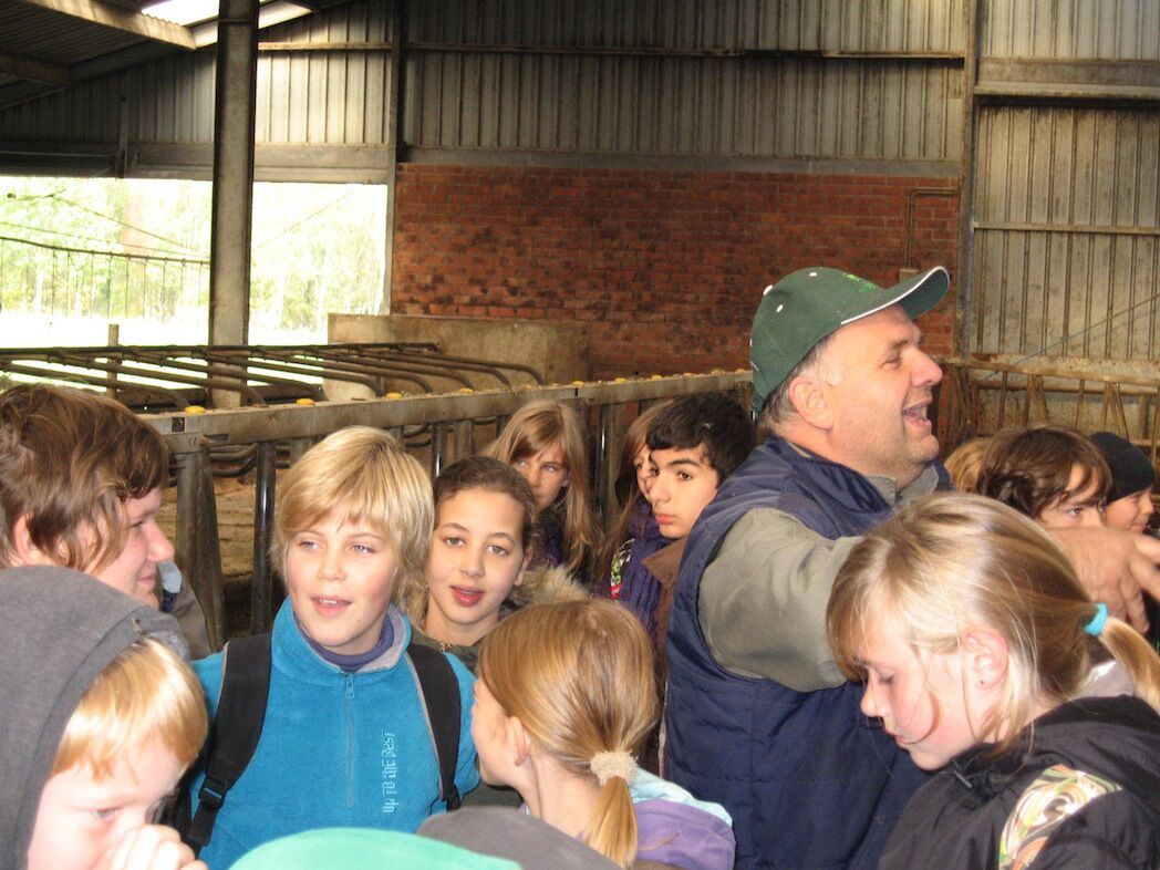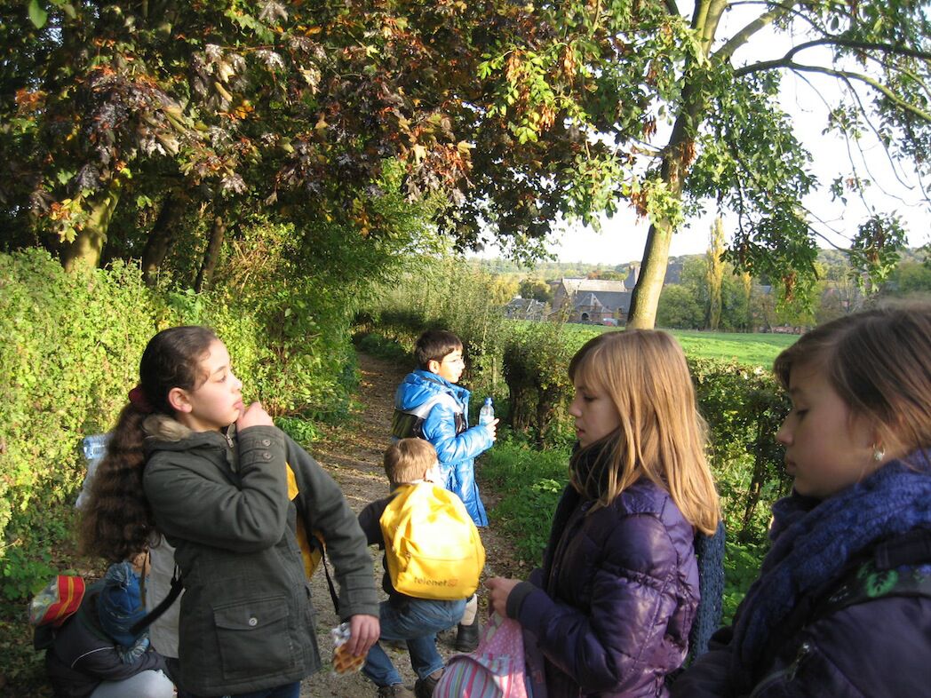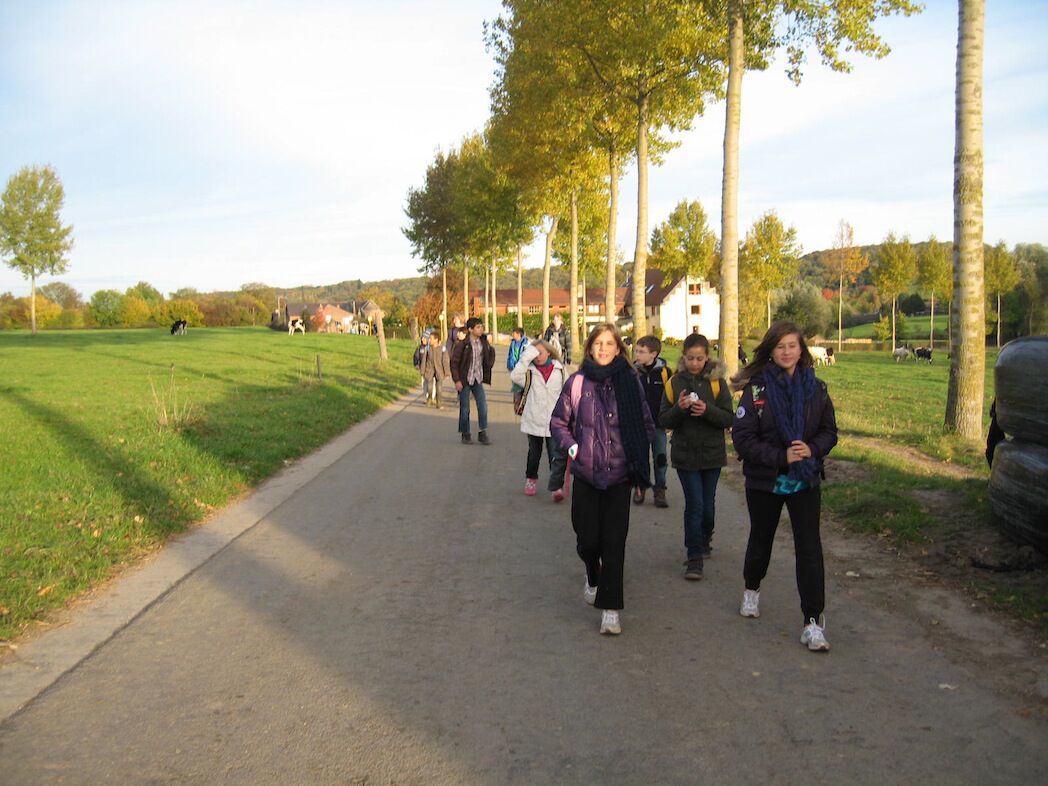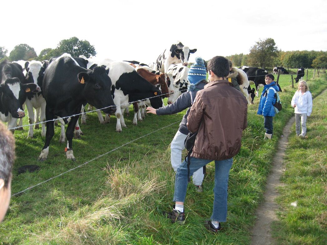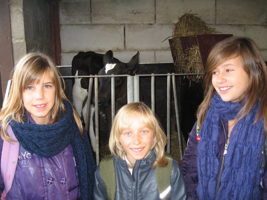 Wat een kilometers hebben we vandaag weer afgelegd!!! 's Morgens na het ontbijt direct onze stapschoenen aangetrokken en op weg waren we. Gelukkig was het zonnetje weer van de partij, wat het stappen toch aangenaam maakte. We gingen naar een melkveebedrijf. de tocht duurde anderhalf uur. Onderweg stopten we regelmatig voor een hapje en een drankje, en ook even poseren voor de camera. Eenmaal aangekomen kregen we een glaasje verse chocomelk en een koekje. De boer legde dan alles uit over de melkkoe. We mochten een kijkje nemen in de stallen en zagen daar een pasgeboren kalfje; zo lief!!! Na de uitleg keerden we terug. Deze keer namen we een kortere weg, door de wei met koeien. Wel opletten want er stond elektriciteit op de draad. Gelukkig waren de juffen er om de draad veilig opzij te houden terwijl we er onder kropen. Ook nog uitkijken voor de vele koeienvlaaien.... Maar iedereen stapte wel flink door en niemand klaagde. Wat een superbende!!!