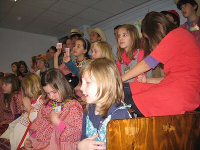 In de namiddag gingen we op bezoek bij het toneelgezelschap van Jenny Tanghe. Stijn was daar toneelmeester en gaf allerlei opdrachten, die de kinderen op het podium tot een goed einde brachten. Hij leerde ons concentreren, improviseren en toneel spelen. Goed gedaan hoor!! Stijn was alleen niet zo goed in namen onthouden, wat wel eens tot grappige situaties leidde!