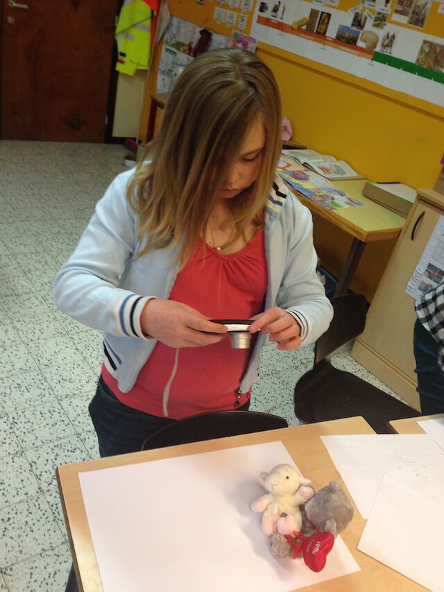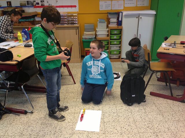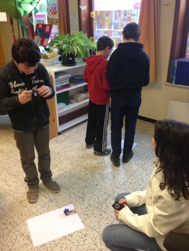 We laten een figuurtje rond een blad lopen. We kiezen een startpositie en trekken een 30-tal foto's terwijl het figuurtje telkens een beetje vooruit gaat. De fotograaf moet wel opletten dat hij niet beweegt, of we zien stukjes achtergrond die we niet in het filmpje willen zien. Als alle foto's getrokken zijn, gieten we deze in een programma 'moviemaker'. Nu nog de tijd instellen en eventueel een effect toevoegen, en we hebben een zelfgemaakt filmpje!!