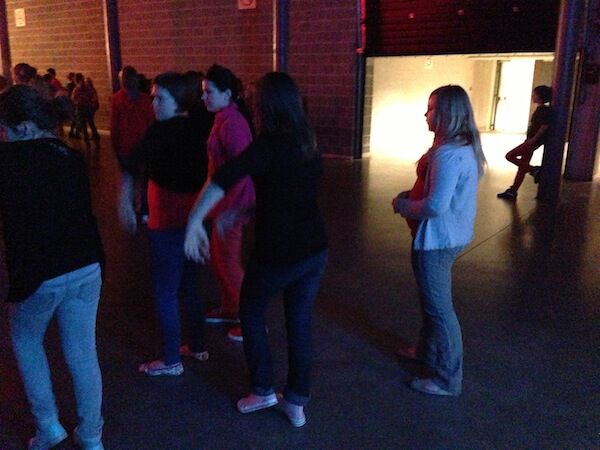 we stappen op muziek door de ruimte en als we een voorwerp tegenkomen, maken we een passende beweging. Zo maken we uiteindelijk een kleine 'dans' rond de reisvoorwerpen.