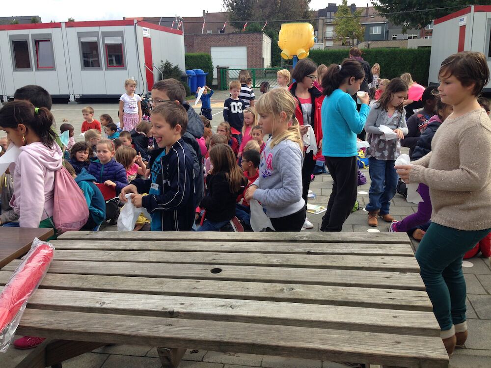 Als we er zijn hoor ik de auto puffen, aan de schoolpoort staan al enkele juffen.