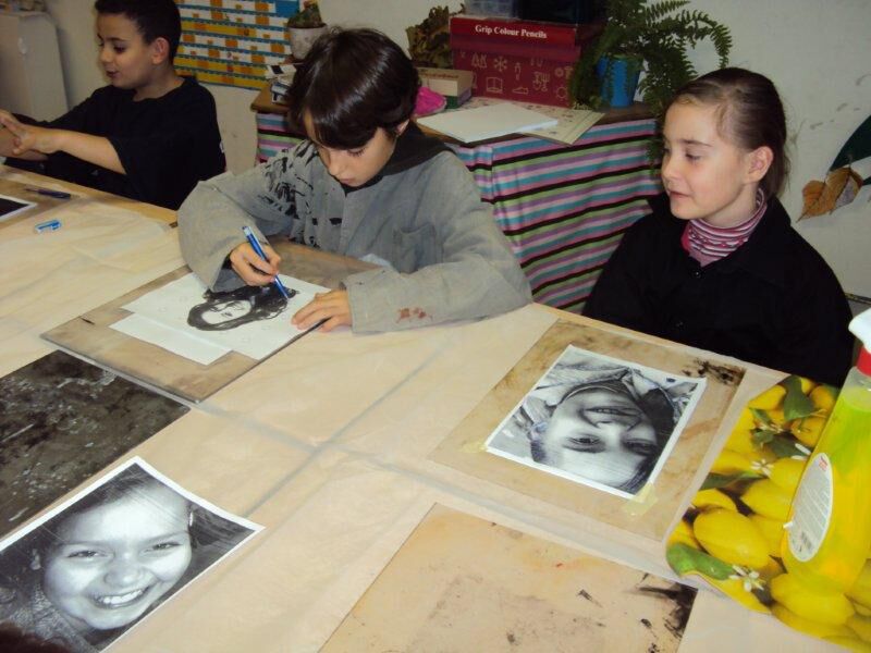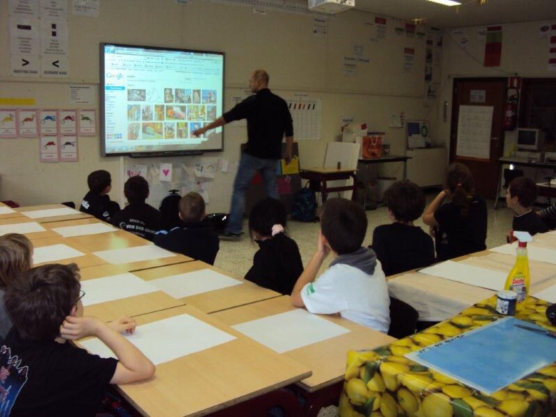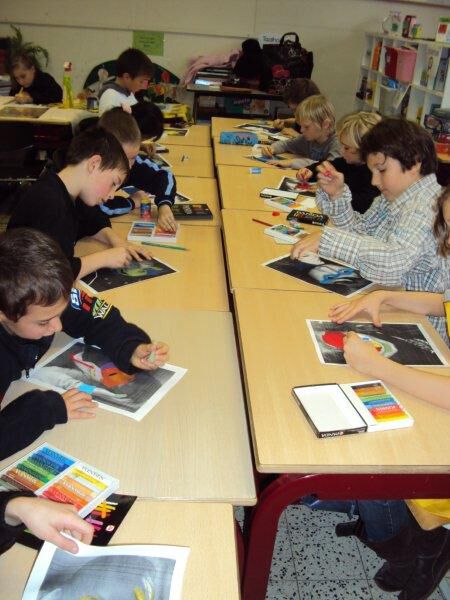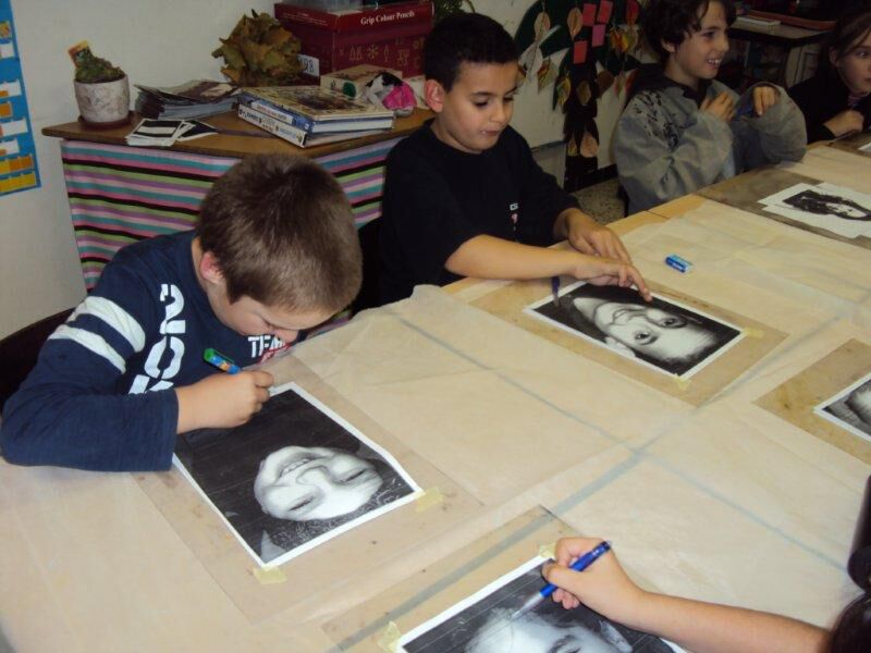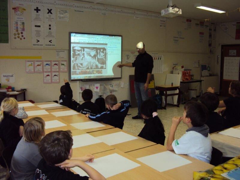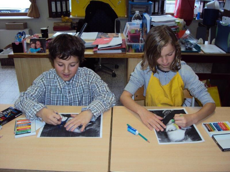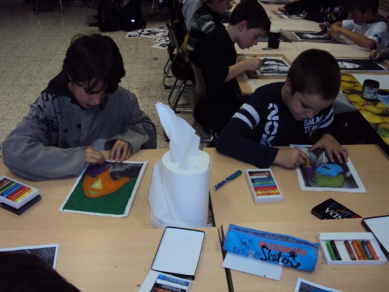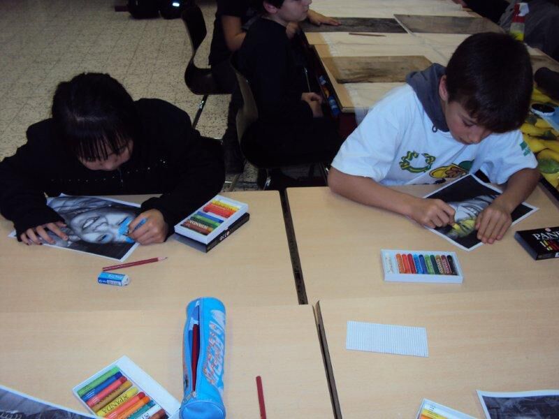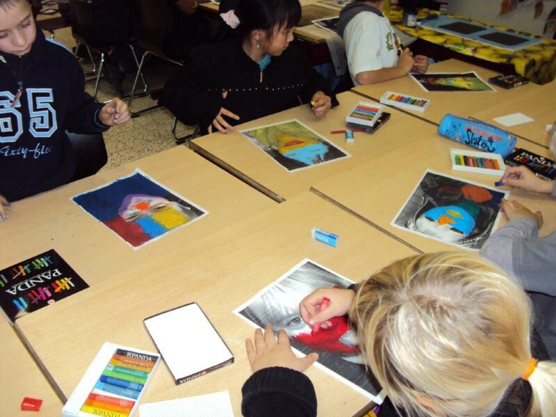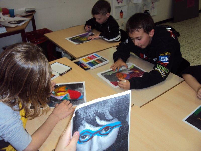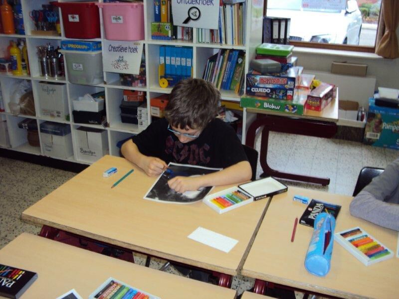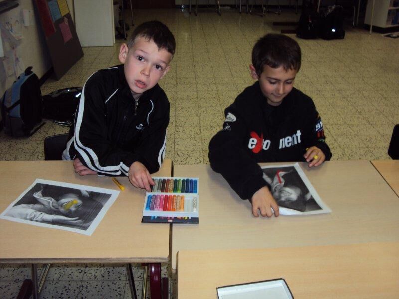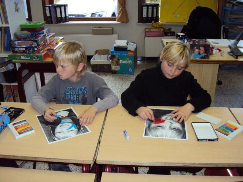 Vandaag hadden we hoog bezoek. De papa van Hind kwam immers langs om ons enkele nieuwe ‘kunst-technieken’ aan te leren. Eerst bekeken we enkele werken van kunstenaars en bespraken we de kleurencirkel. De eerste opdracht die we kregen was een ‘juist’ portret van iemand maken. Dit bleek helemaal niet zo eenvoudig! Koen leerde ons dan ook twee technieken om ‘een beetje vals te spelen’. We leerden een foto van onszelf bewerken met oliekrijtjes waardoor we een portret kregen zoals kunstenaar Andy Warhol. In het tweede groepje deden we monotype. We kregen een plaat waarop een laagje inkt werd gelegd. Daarop werd een wit blad en een foto gelegd. Met een balpen gingen we rond de lijnen die we op de foto zagen. Het resultaat was prachtig!