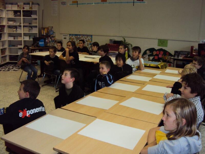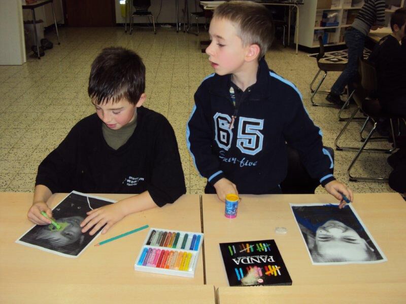 Opnieuw hoog bezoek vandaag. De mama van Arnout kwam immers met ons knutselen. Ze had héél erg groot tekenpapier meegebracht. Eerst hebben we gepraat over wat er in de aarde, op de aarde en boven de aarde is. Daarna moesten we dat tekenen in groepjes van 3. ‘Juf Els’ leerde ons zelfs hoe we zonder passer een heel mooie cirkel kunnen tekenen. Nadat we alles in potlood hadden getekend, mochten we de binnenkant van de aarde schilderen. Als we dat tot een goed einde hadden gebracht, gingen we aan de slag met de Panda-krijtjes. Volgende week moeten we enkel nog de lucht schilderen met verdunde verf. Wat is (en wordt) het een prachtig kunstwerk!