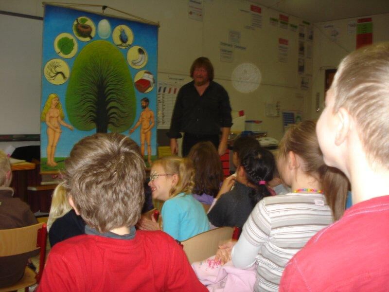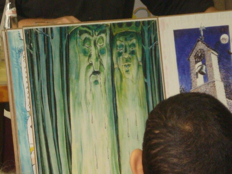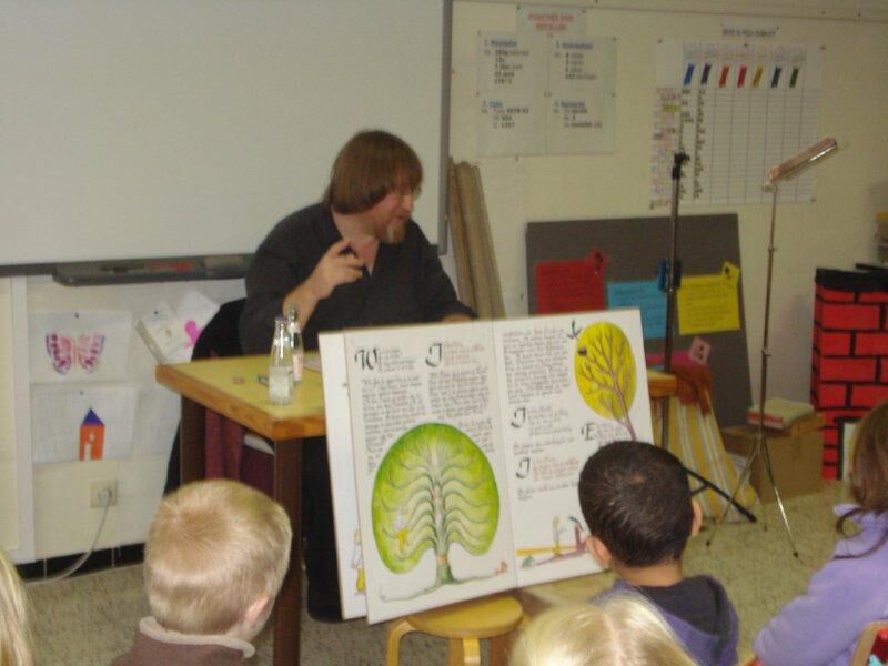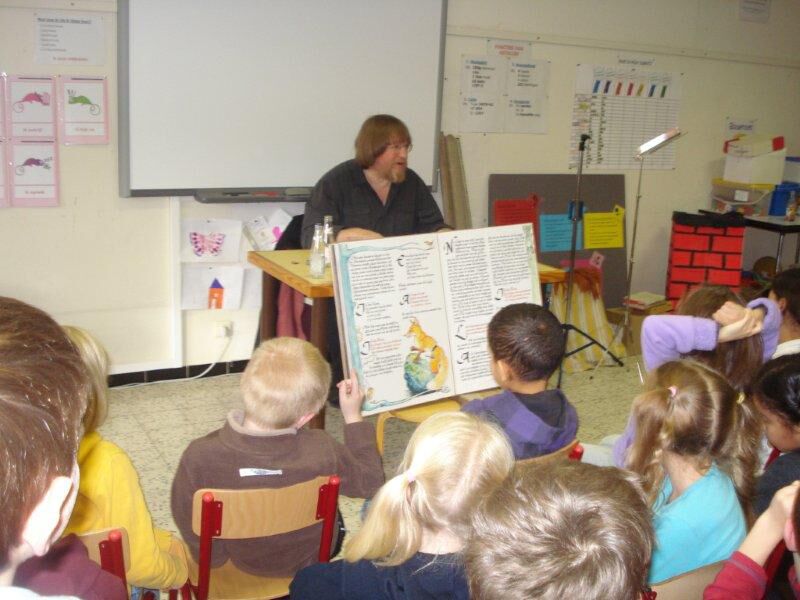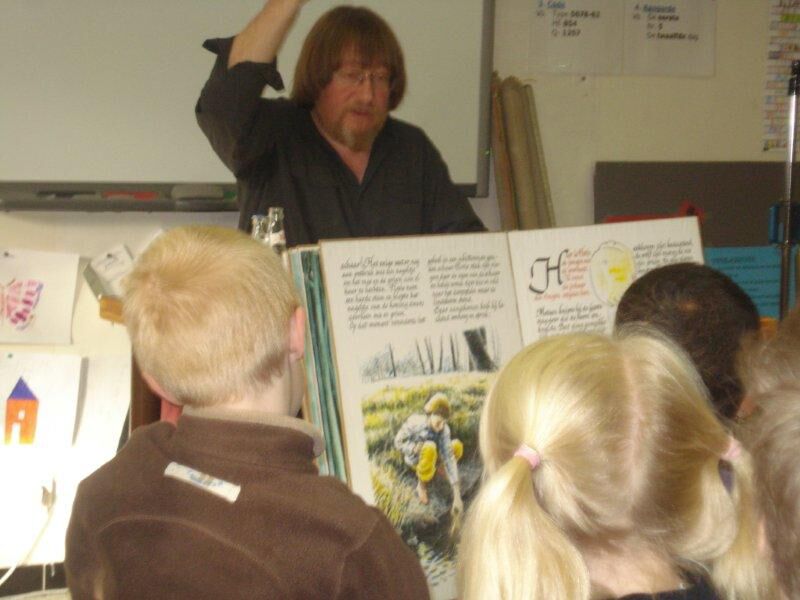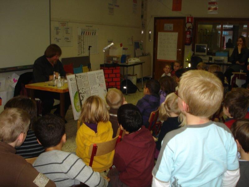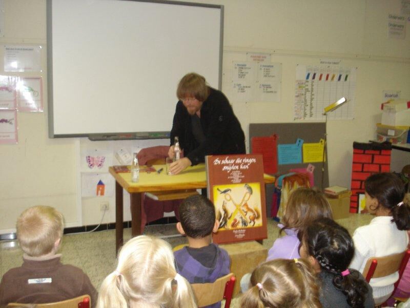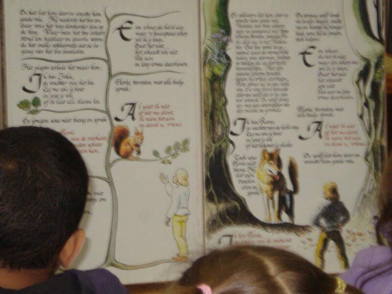 Deze namiddag kwam Rufijn De Decker langs in onze klas. Hij stelde zijn sprookje ‘De schaar die ringen snijden kan’ aan ons voor. Hij had daarvoor een héél groot boek bij. Hij vertelde het verhaal over Floris van de overkant die op zoek ging naar de schaar om de prinses te kunnen bevrijden uit de boom.